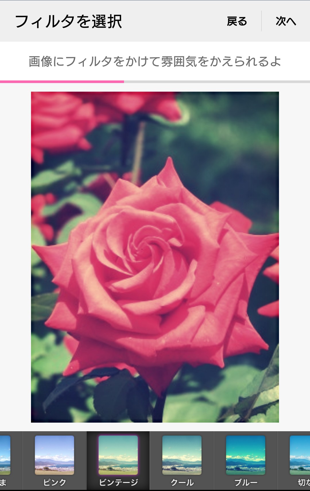 さまざまなフィルタが用意されているので好きなものを選びます。筆者は「ビンテージ」を選択してみました。更に「次へ」で進みます。
