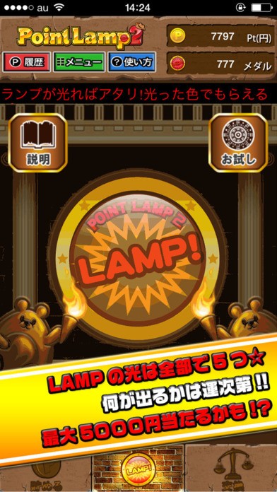 メダル1枚で1回、ランプゲームにチャレンジできます。画面下にある「LAMP!」をタップするとゲーム画面が開きます。