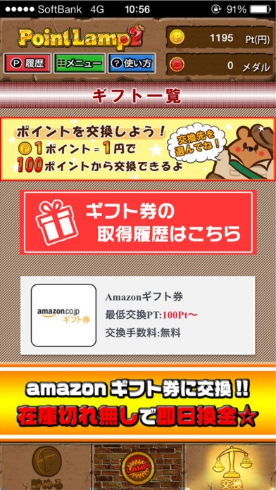 「ポイントランプ2」は貯めたポイントをiTunes、Amazon、Pex(ポイント合算サイト)のギフト券に交換することができます。