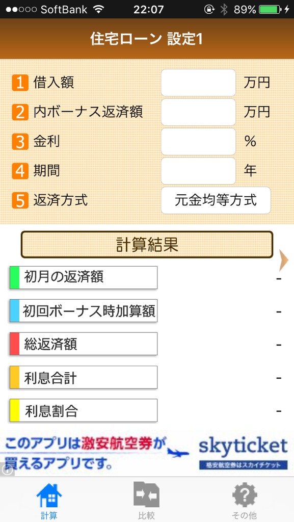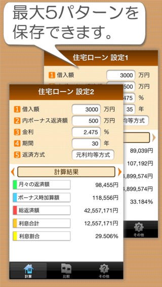 入力画面を指でスライドすると設定画面の切り替えができ、違う形のローンの入力もできます。