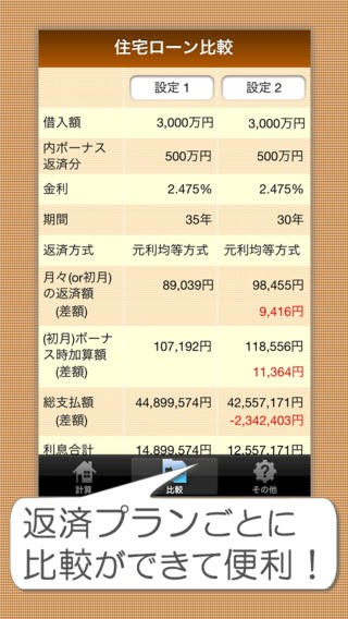 またアプリ下部【比較】をタップするとこのように返済プランの比較を行えます。紙面をペラペラとめくりながら比較する手間なくすぐ確認できるのが強みですね。