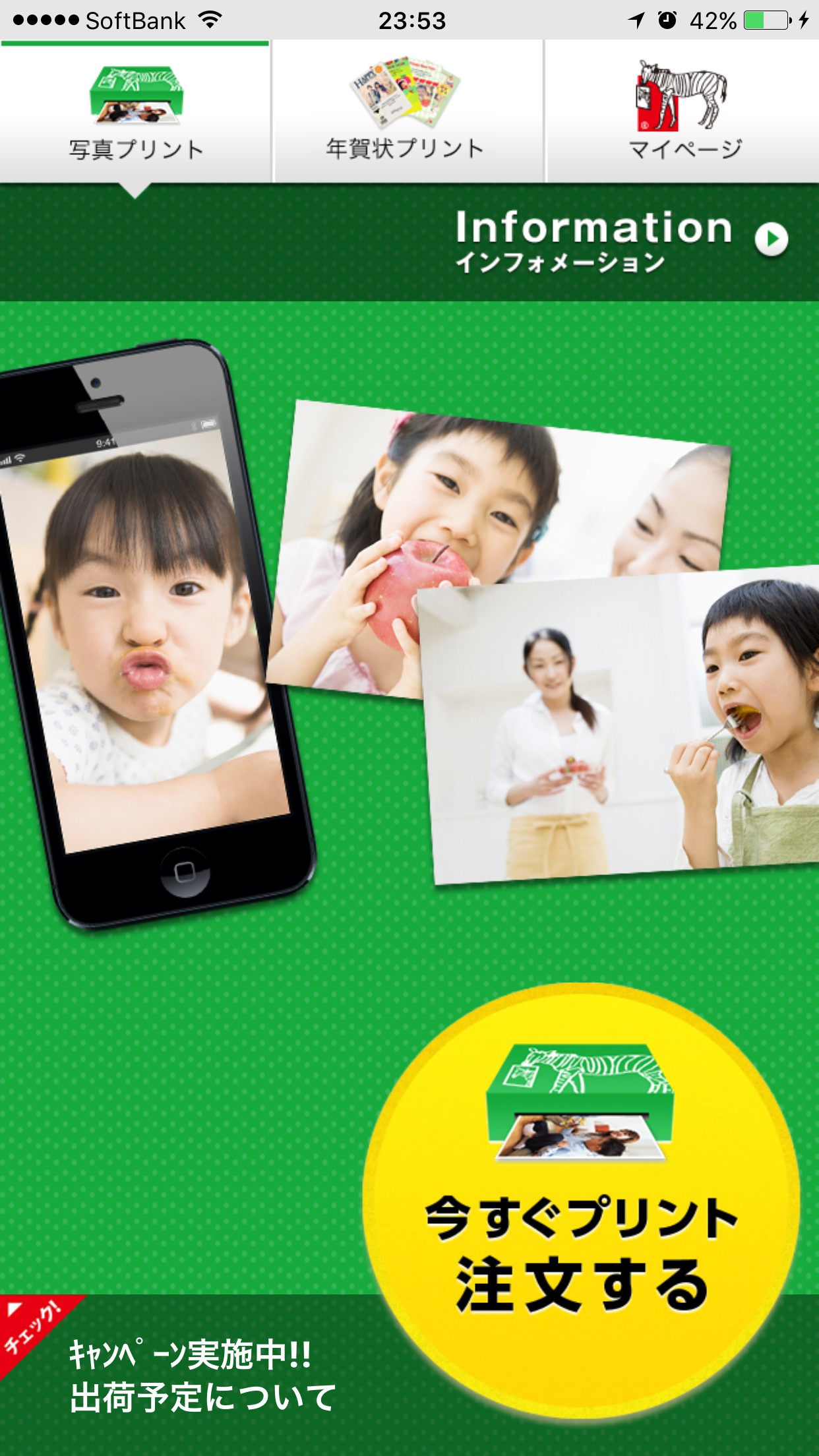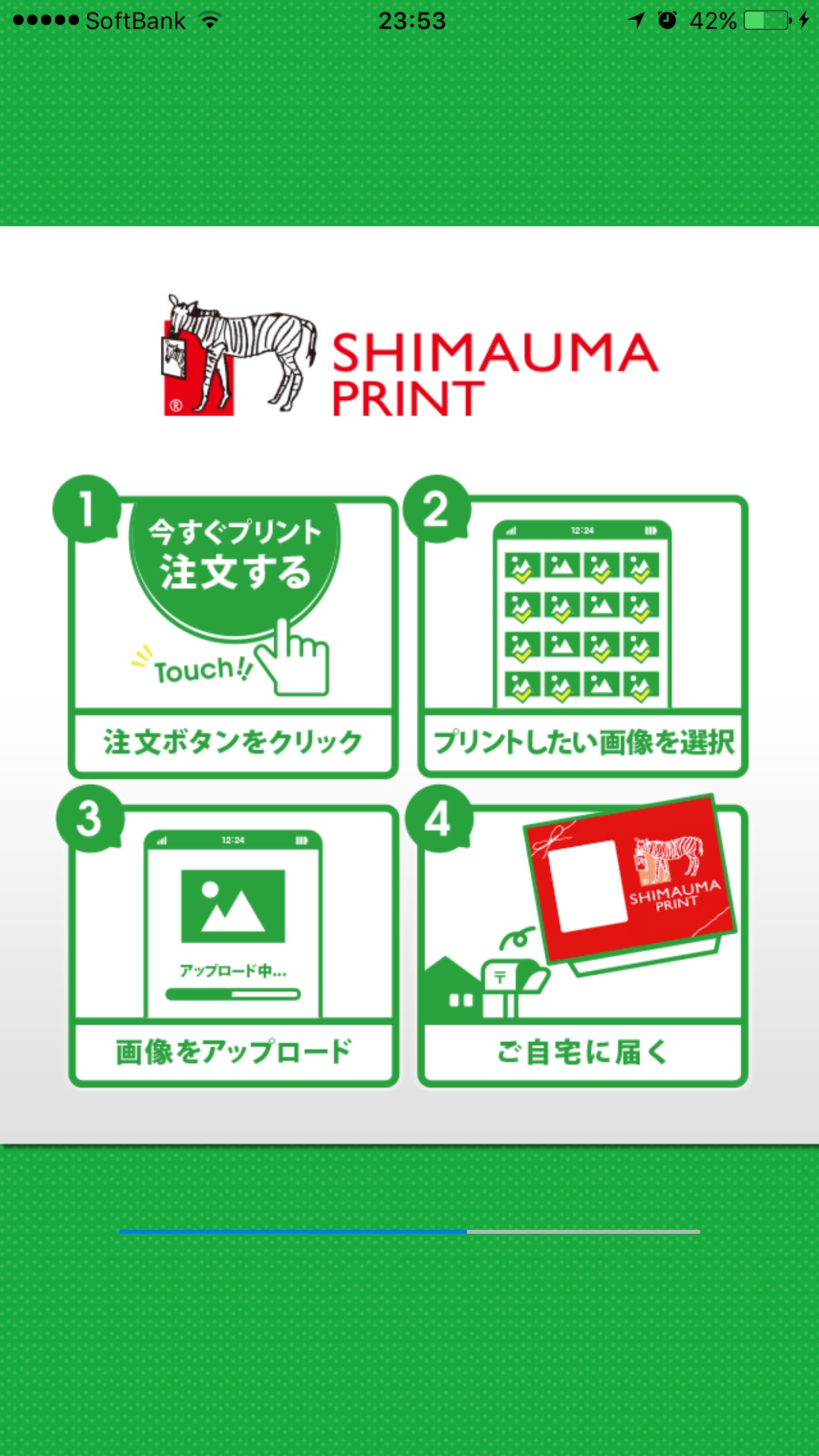 ホーム画面にある「年賀状プリント」をタップすると、「しまうま年賀状2017 スマホ写真で簡単注文」のダウンロードサイトが開きます。