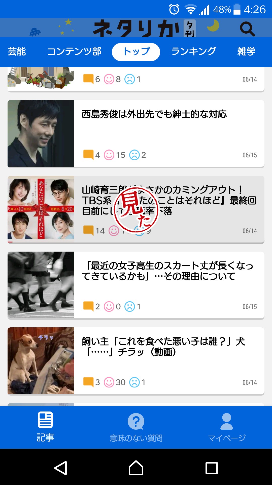 トップ画面には「おすすめネタ」として、あらゆるジャンルのニュース記事から厳選されたものがいくつか並んでいます。おすすめネタの記事タイトルを一目見て、気になったニュース記事をすぐに読めるのもうれしいですね。閲覧済みの記事には「見た」マークがつくので、どんどんマークがついていくのも楽しいです。