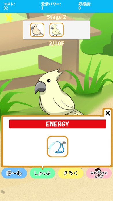 タップして貯めた『コスト』でエサを購入し、キャラクターとの愛情や好感度を上げて、ステージをクリアしていきます。