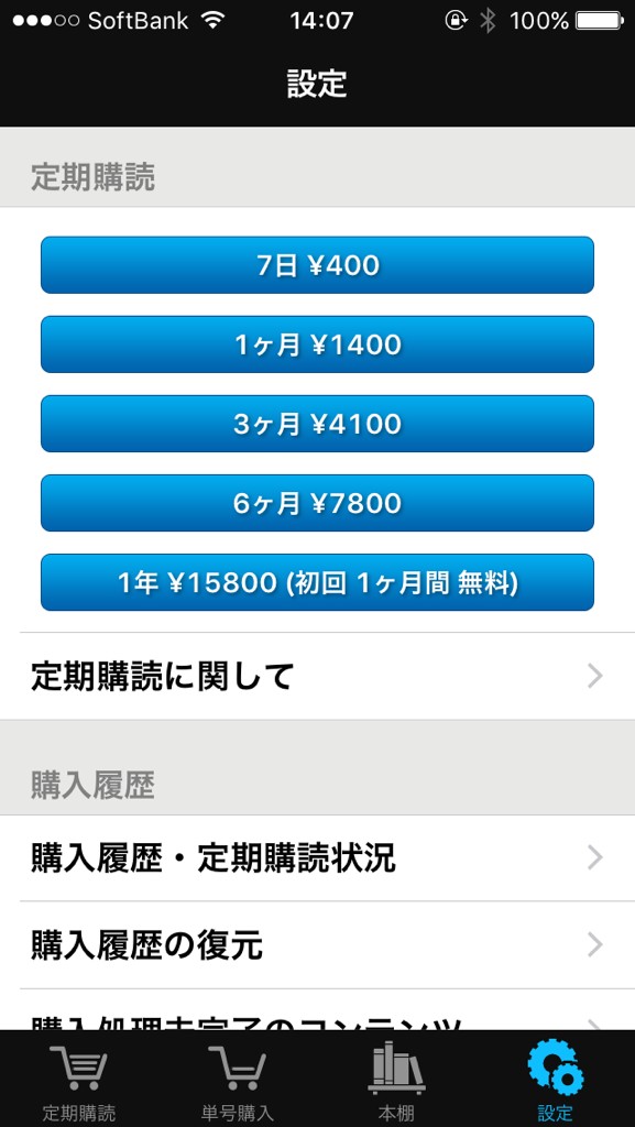 アプリトップページから【定期購読を申込む】をタップするとこのように料金の一覧が表示されます。
