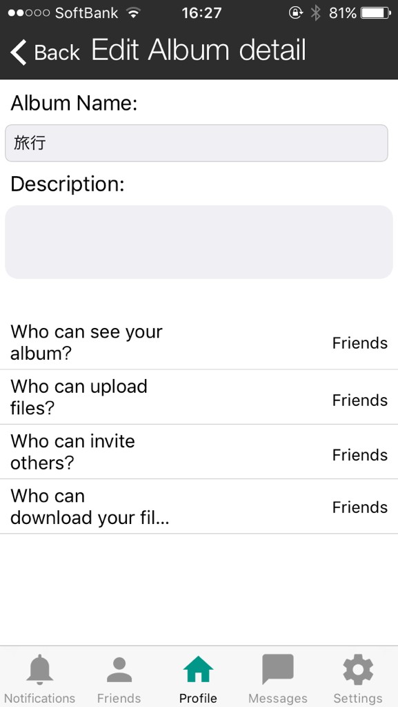 トップページの上部「フォルダマーク」をタップしてアルバムを作ります。アルバム名を入力して作成します。そのあとアルバムの閲覧条件を設定します。初期設定ではこのアプリ内での友人のみが閲覧できる形となっていますが、さらに細かく閲覧できる人を設定可能です。そのあとに写真などシェアしたいものをアルバム内に追加していきましょう。無料会員のままでも50ファイル登録できるので、たくさん撮影しても問題ありません。アプリ内に友人を登録しておくと、フォルダ内のファイルを登録した友人だけに共有することができます。