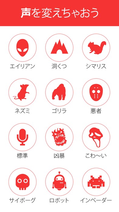 アプリ下部にある右からニ番目のアイコンをタップすると動画にのる人間の声やあたりの音が様々な声に変化します。こちらも上記二つと同様に色々とタップして試してみると面白いです。