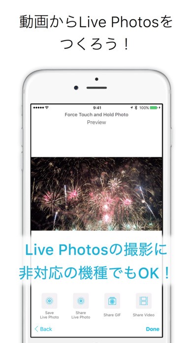 Live Photosは通常の写真に比べて臨場感があり、動画に比べると見たい一瞬の動きや輝きを逃さず確認できるので、面白く楽しい機能です。このアプリでは通常の動画をフレーム毎に分け、気に入ったフレームを中心に切り取って、再生したい部分をLive Photosサイズに調整することができます。このアプリを使用すれば6Sシリーズ以前の非対応機種でもLive Photos作成を行えます。古いバージョンしかもっていない方でも安心して使ってください。