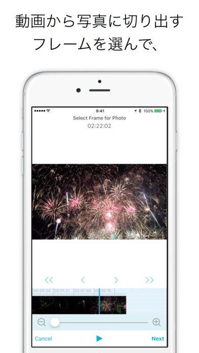 まずは写真のフレームを選択します。フレーム毎にサムネイルが表示されており、拡大をすることでより細かい部分から選択を行えます。再生をしながらだいたいの位置を決めて、そこから細かくフレームを選択していく方法が編集しやすくおすすめです。使用したいフレームが決まったらアプリ下部の「次へ」をタップします。