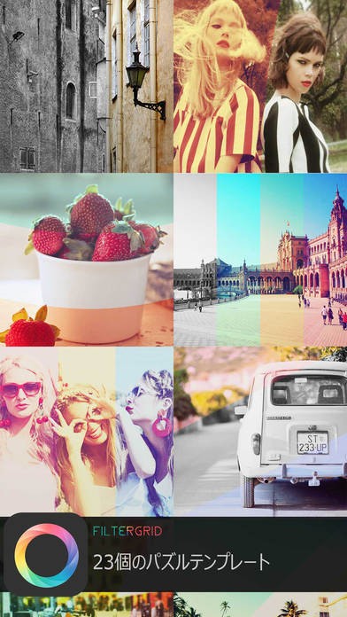 もう一つの図形テンプレートも20種類以上揃っています。図形はひし形やハート型などのシンプルな図形から、スマイルマークやLOVEなどの文字をかたどったものまであり、バライエティ豊かで魅力的です。図形の大きさはピンチアウト・インで変更することも可能ですよ。そして、マスによってフィルターの種類を変えることも出来ます。センスが光るポイントですね。フィルターの色合いもスライド調整で調節可能ですよ。