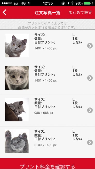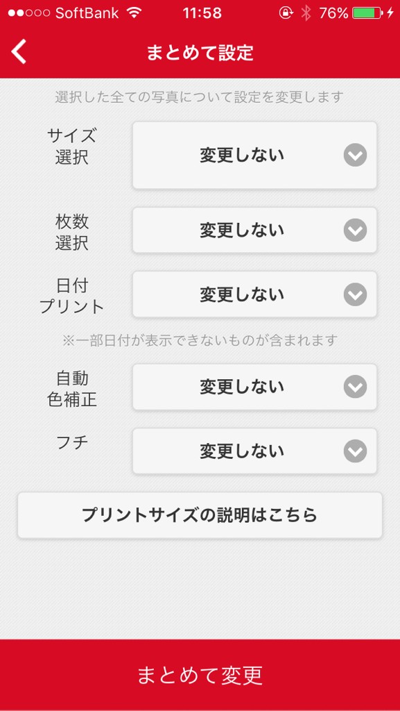 すべて同じサイズでプリントしたい場合は一括設定できるので、写真の数が多ければ多いほど助かりますね。