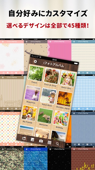 「iフォトアルバム」には、オリジナルのアルバムを彩るデザインテーマが45種類も用意されています。自分の好きな雰囲気のものを壁紙にすれば、アプリでアルバムを開くのが楽しみになるでしょう。かわいいもの、クールなもの、好きなスタイルを選択してみてください。