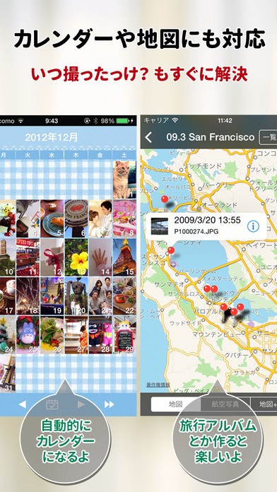 写真と動画がどんどんスマホに溜まっていくと、いずれ整理するのがおっくうになってしまいますね。だからこそあらかじめアプリ「iフォトアルバム」で整理しやすい環境を整え、撮影に集中できるようにしておきましょう。写真や動画のデータを読みとってカレンダーや地図に表示することもできるため、データをかなり身近に感じることができます。整理整頓が苦手な人でも楽しみながら利用できる本アプリは、多くのユーザーにオススメできるポテンシャルを持っているのです。