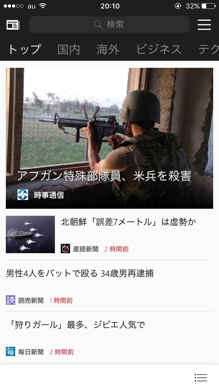 こちらがアプリのトップ画面です。トップ画面上部には、「トップ」「国内」「海外」「ビジネス」「テクノロジー」「話題」「スポーツ」「エンタメ」とカテゴリーがあります。画面を左へスライドする事で各カテゴリーに切り替える事ができます。ニュースの情報元は、大手新聞社ばかりで、全国のニュースを閲覧可能です。