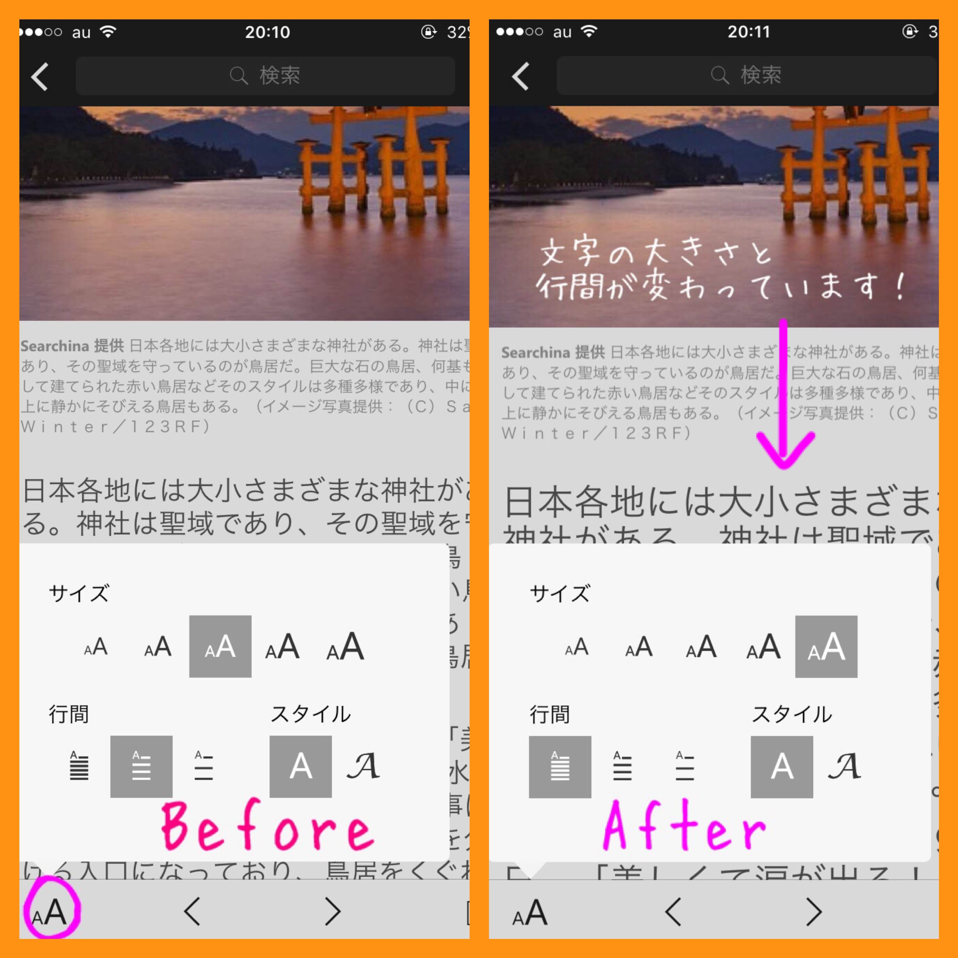 使い方は各記事の左下の「A」のマークを押します。そうすると「サイズ」「行間」「スタイル」と出てくるので、自分の好みに設定へ変更するだけです。しかもこの変更はリアルタイムで反映されるため、記事の文字を見ながら自分好みにできます。
