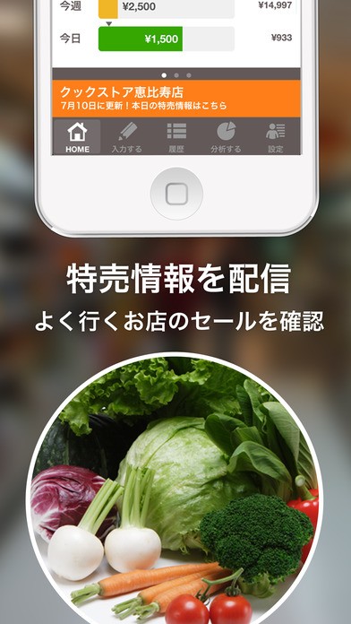 レシートを撮影後は、メイン画面に今月、今週、今日の支出が表示されます。グラフ化により、支出内容をさっと確認できるので、予算と支出の比較を簡単に行えます。
