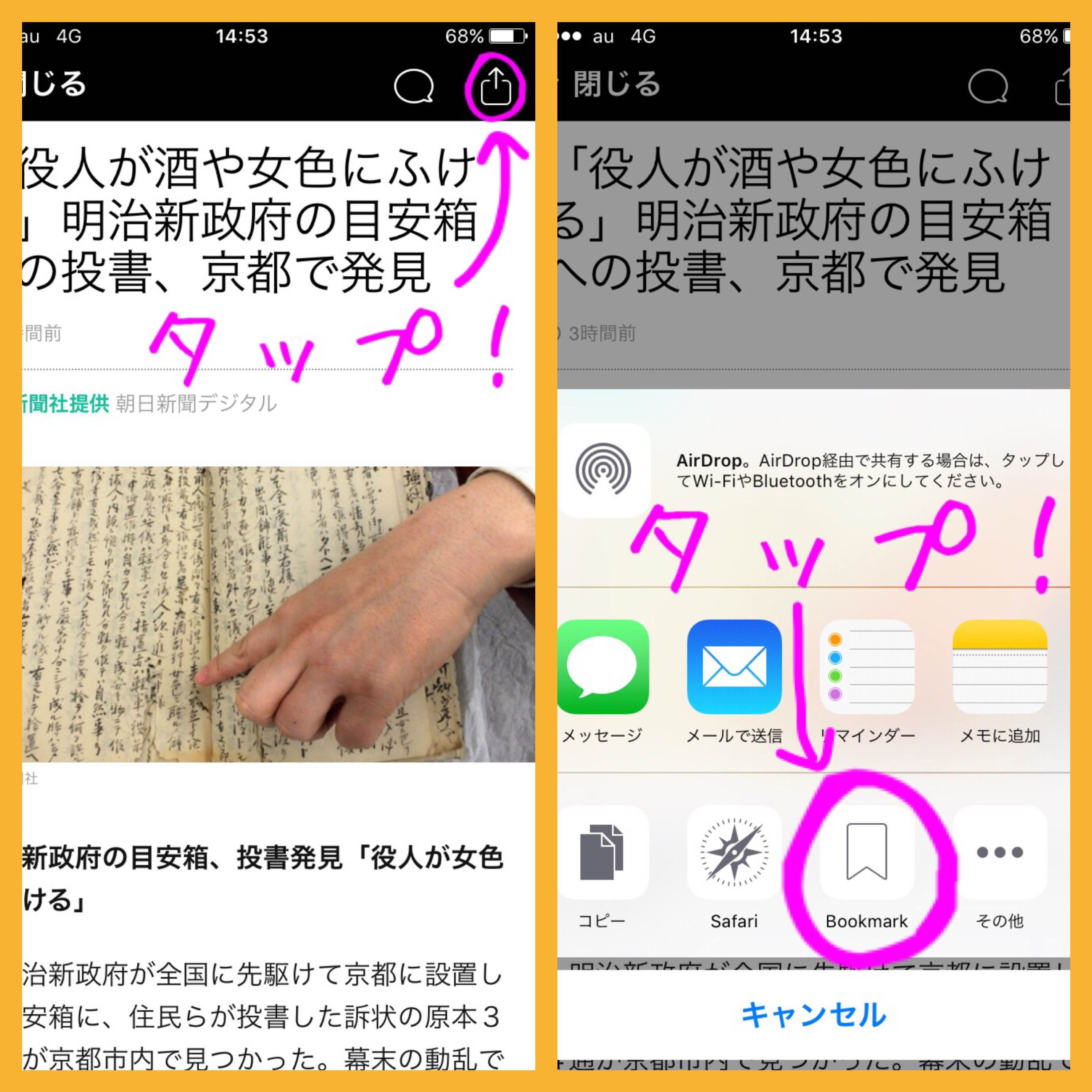 ブックマークの付け方は、各記事の画面右上「上矢印マーク」をタップ後にポップアップが出てくるのでそこからブックマークを選択するだけです!(画像参照)