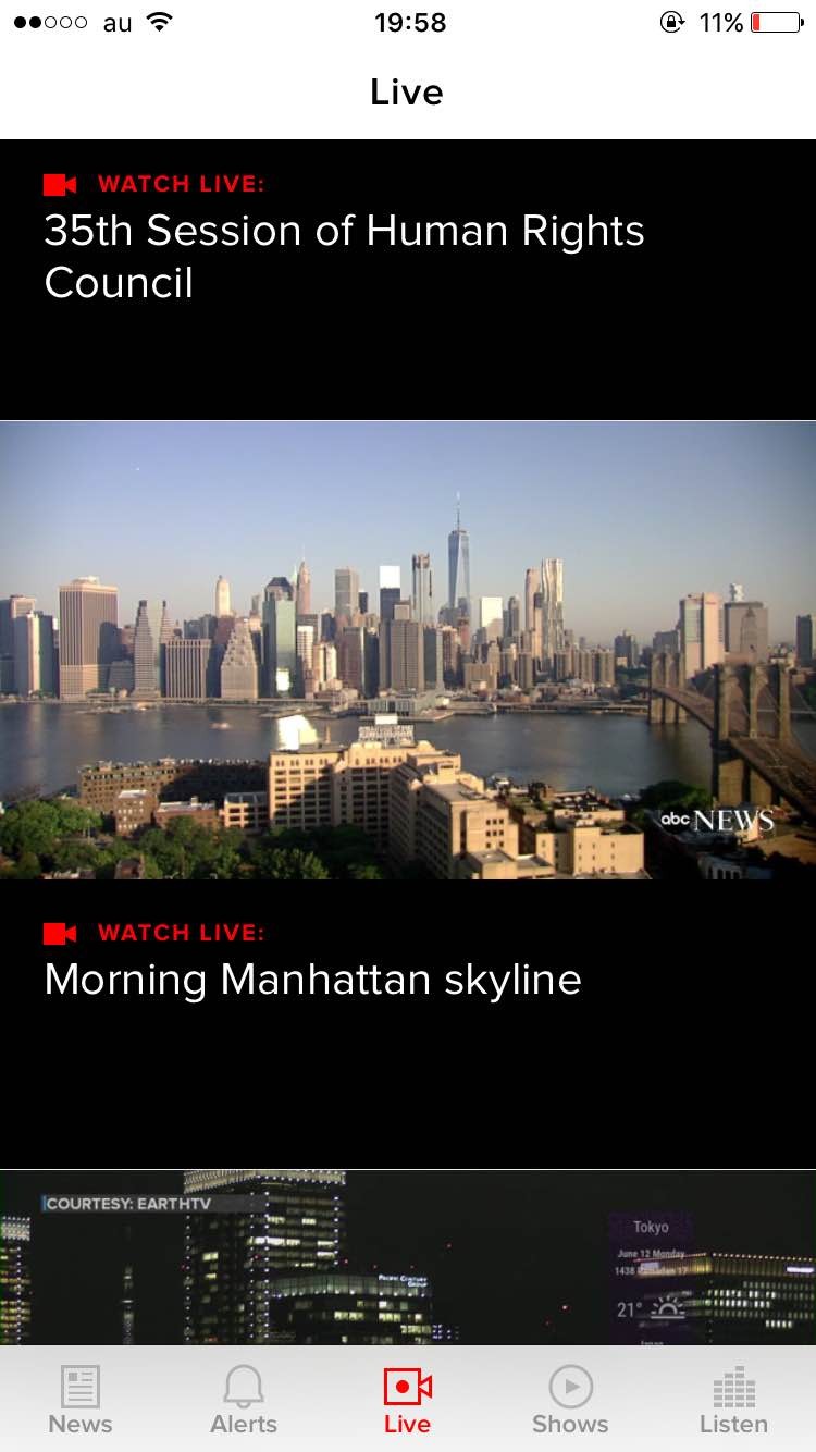 アプリ画面下部に「News」「Alert」「Live」「Show」「Listen」の順に各アイコンが並んでいて、「News」では常に最新のニュースや人気のニュースを多数見る事が出来ます。ここでは記事によるニュースだけでなく、ニュース映像も掲載されていてアメリカ政治やエンタメ情報が盛りだくさんです。「Live」では世界のあらゆる場所からの「生中継映像」を見る事が出来ます。下記画像はマンハッタンの朝の様子が映し出されています。