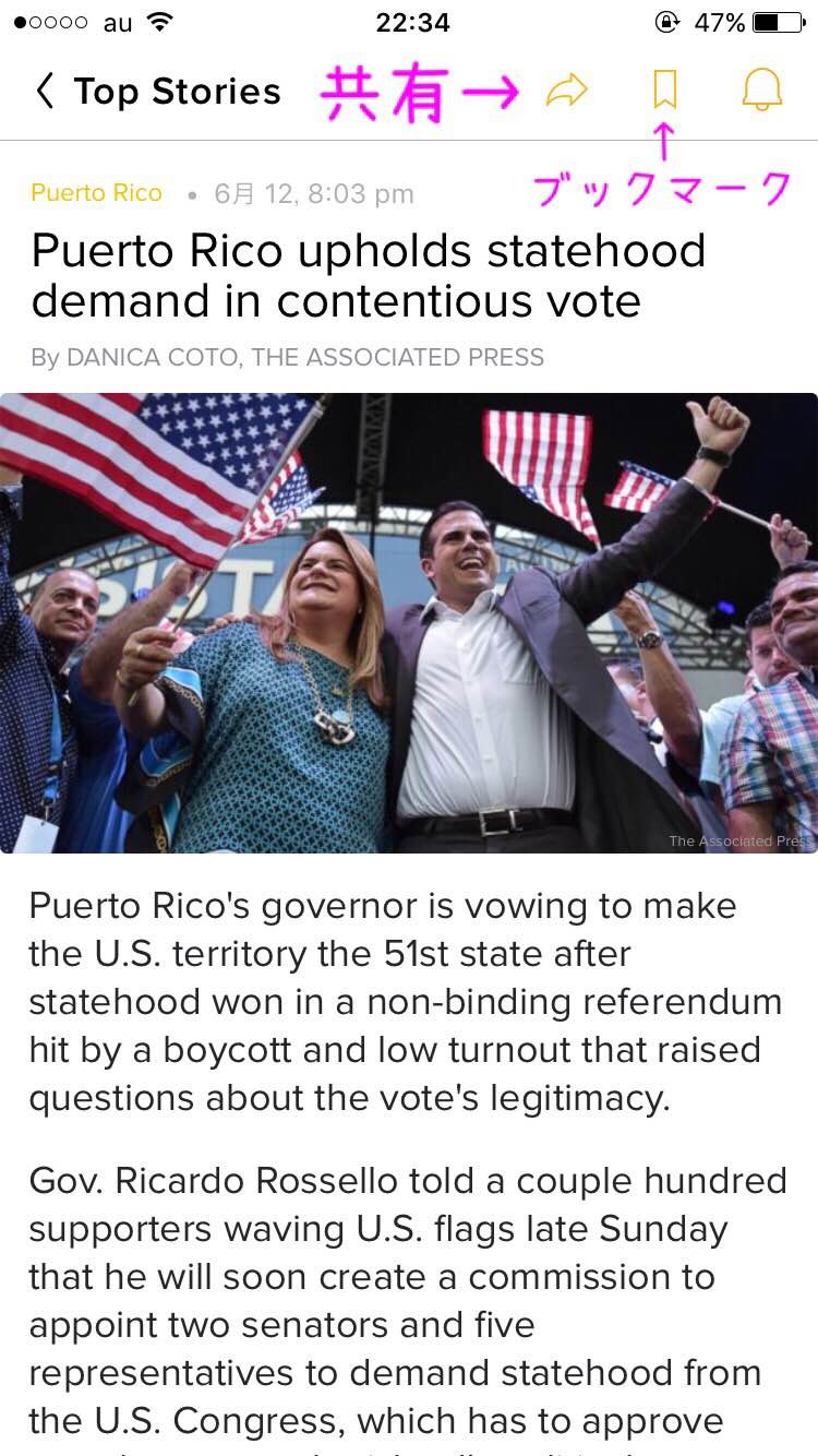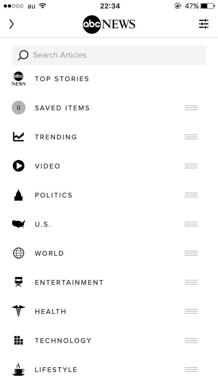 日本のニュースアプリでもよく見かけるブックマーク機能はもちろん「ABC news」アプリにもあります。各記事の右上に黄色いアイコンが3つあります。これの真ん中がブックマークで、ここを押すだけでお気に入りの記事はブックマークされます。