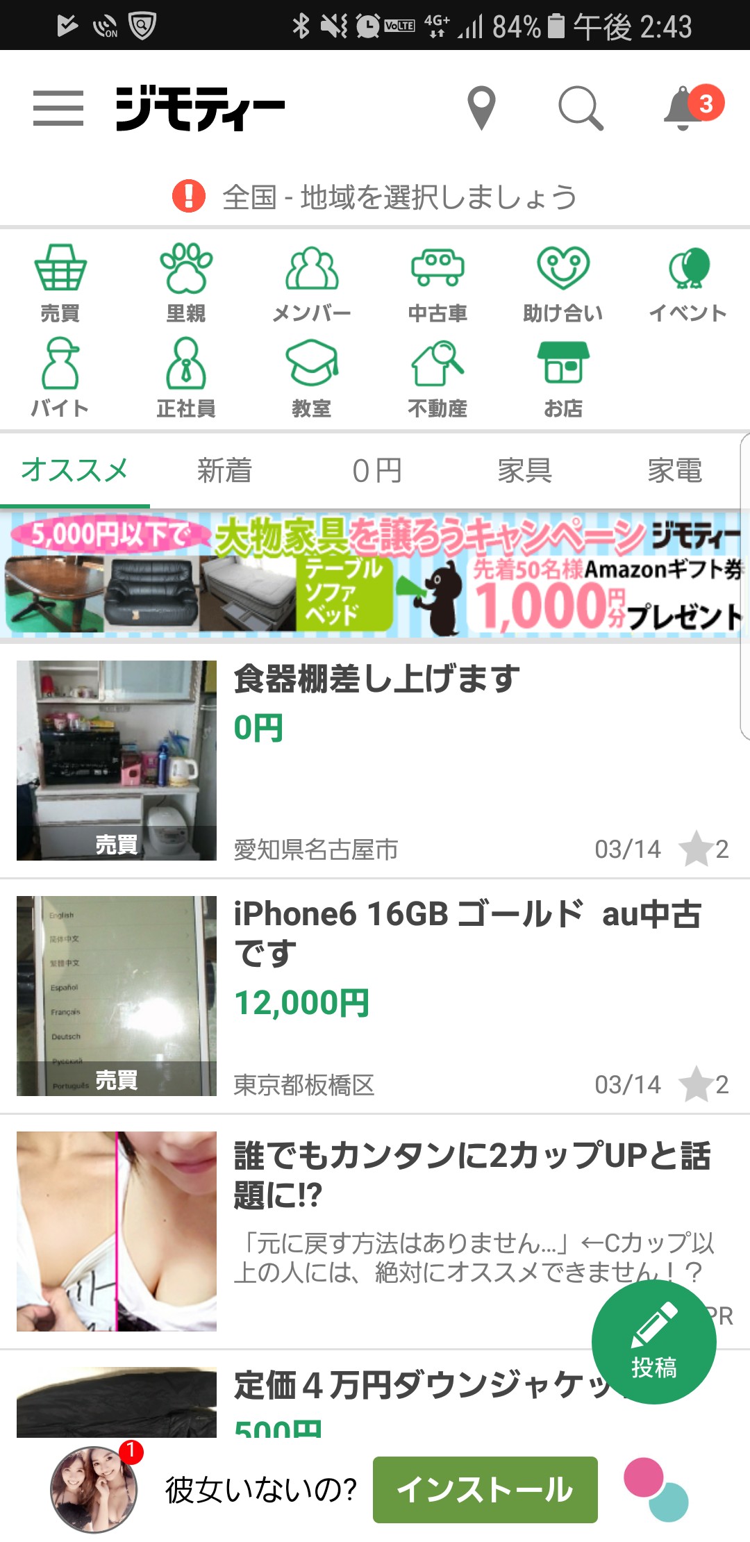 ジモティーでは、中古品の売買はもちろん、生き物の里親、アルバイト、中古車、メンバー募集、習い事など様々なジャンルの掲載があります。地域を選択することで自分の住む都道府県の募集内容に絞って検索できるので便利です。こちらの取引は売る側、買う側が交渉後、直接会って取引するようになります。大型家具を購入したら車に乗らなかったということもあるので取引前に受け取り方法を考えておくといいかもしれません。地元取引で仲介料もないので0円出品も多く掲載してあります。