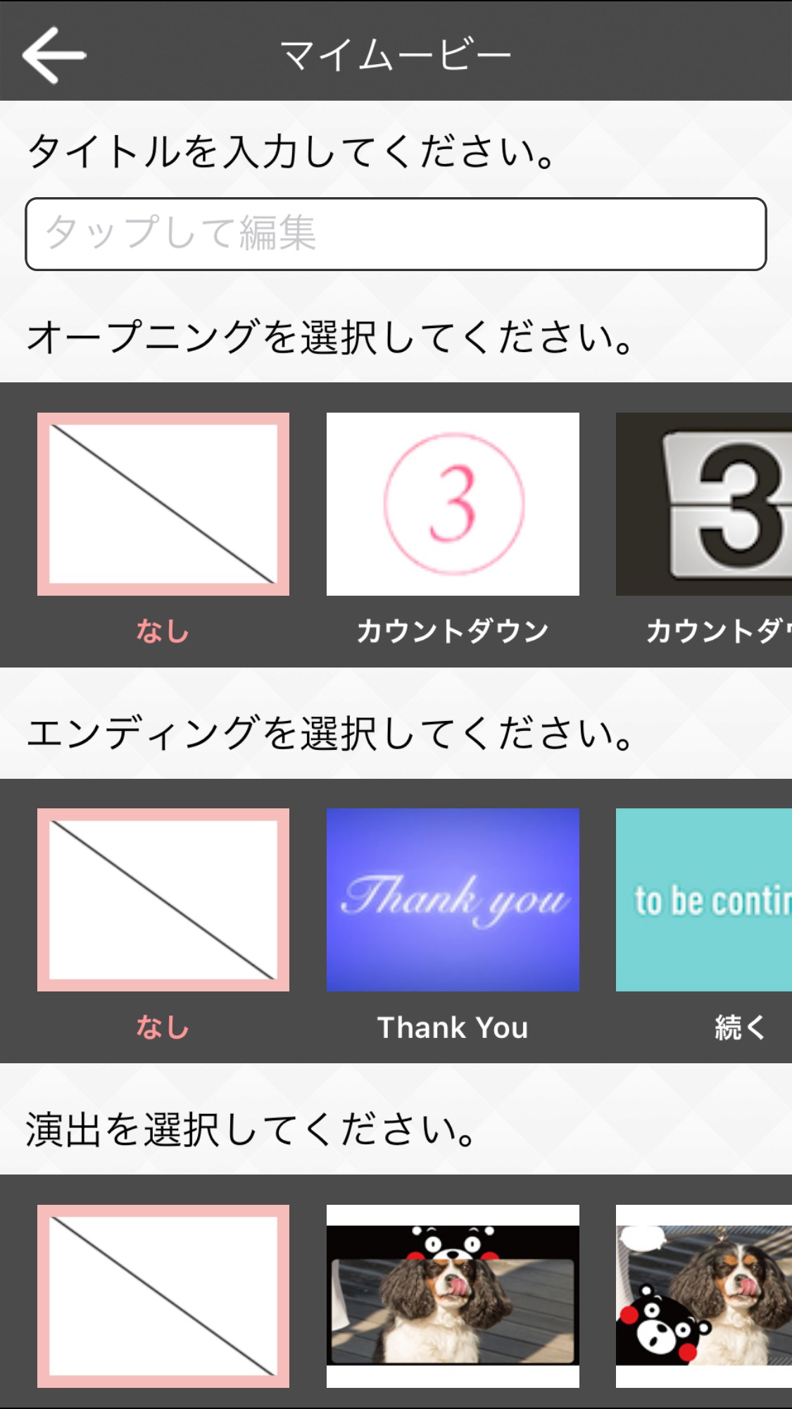 エンディングの画像を選びます。Thank you、to be continued、Fin、スタッフロール、季節ものなどなんと30種類近くの画像から選べます。終わりを締めくくる大事な画像なので素敵なものを選びたいので、これだけ多ければきっとしっくりくるエンディング画像が見つかりそうですね。