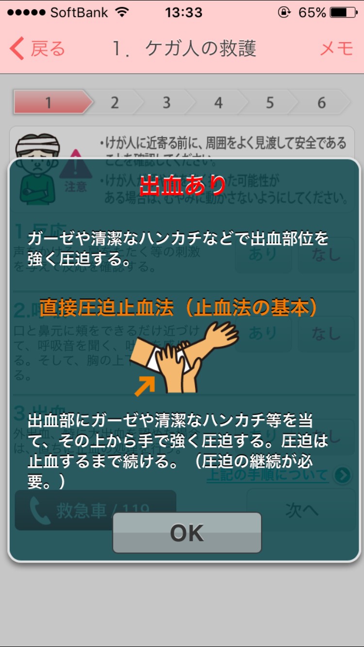 この質問事項に答えることによって、その瞬間に行うべき行動が救急車を呼ぶことなのか止血をすることか等、順序だてて説明してくれます。