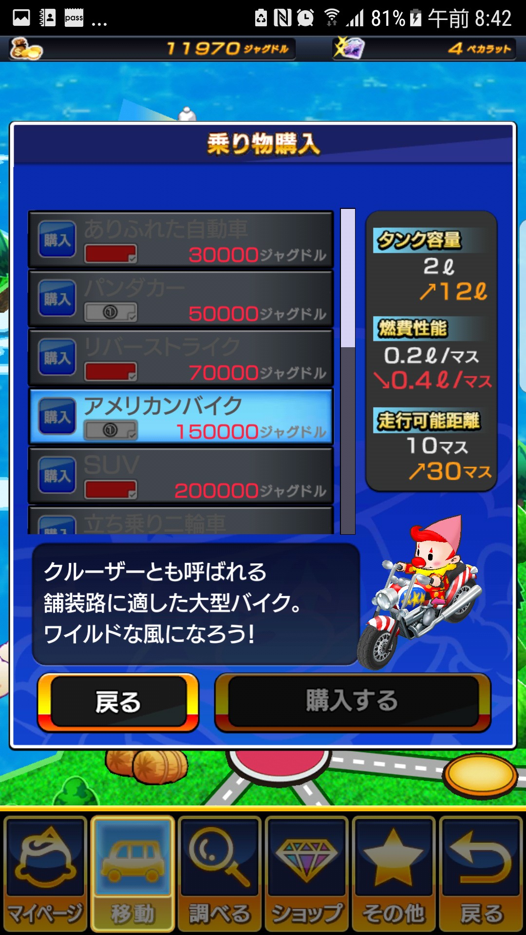 「乗り物購入」では自動車やバイク更にはユニークな乗り物( UFOやホバーボードやジェットパックなど)