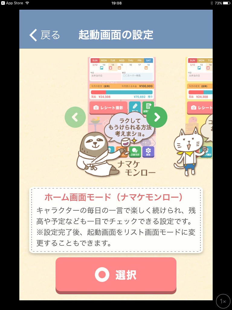 また最初に起動したら、ホーム画面に表示する可愛いキャラクターをナマケモノ・ネコ・アルパカの中から選ぶことができます。