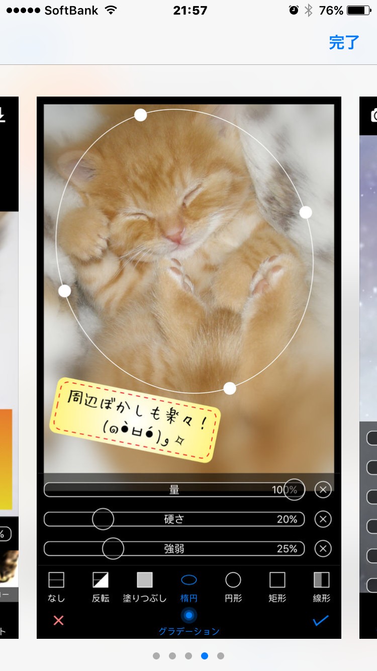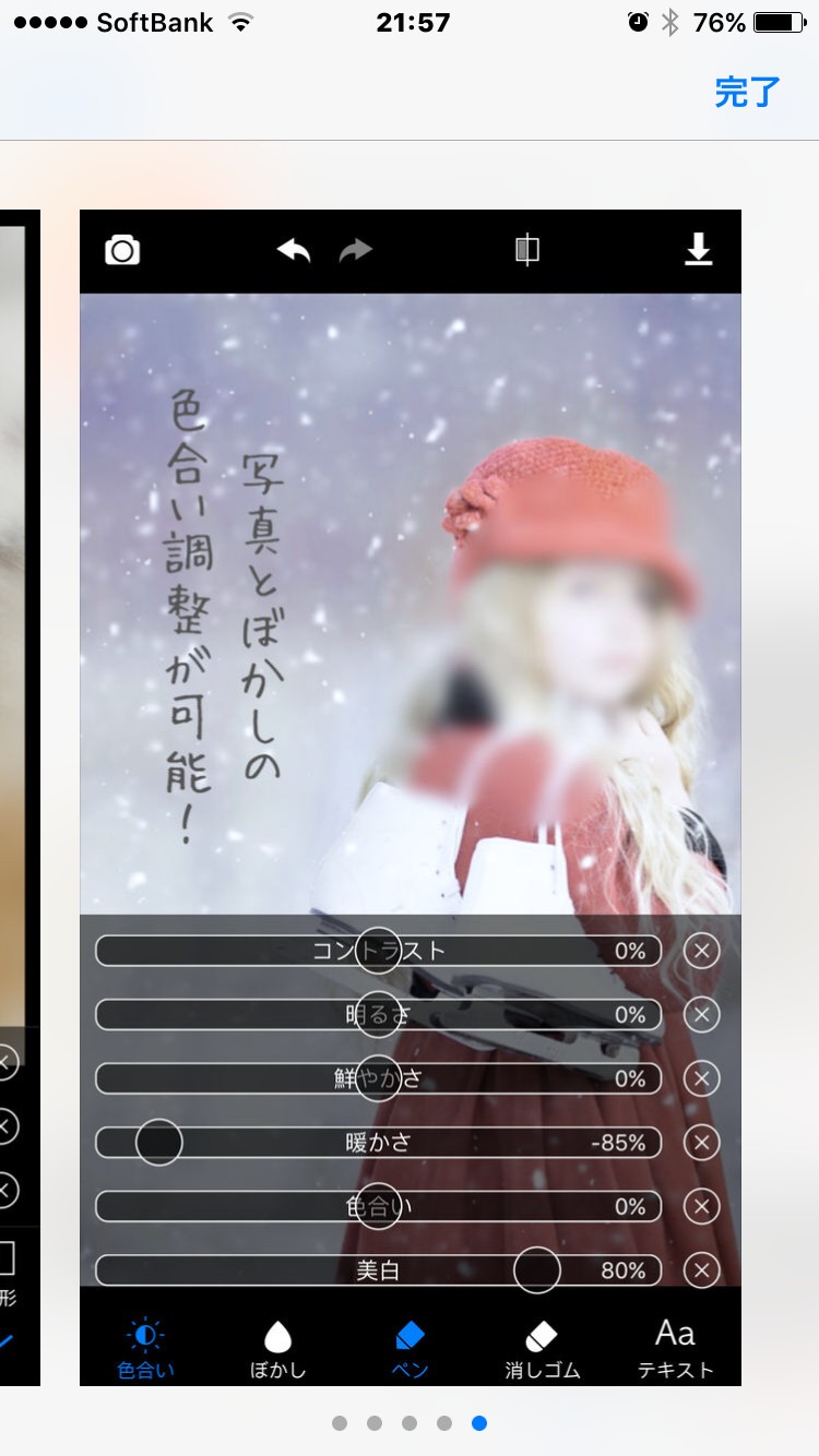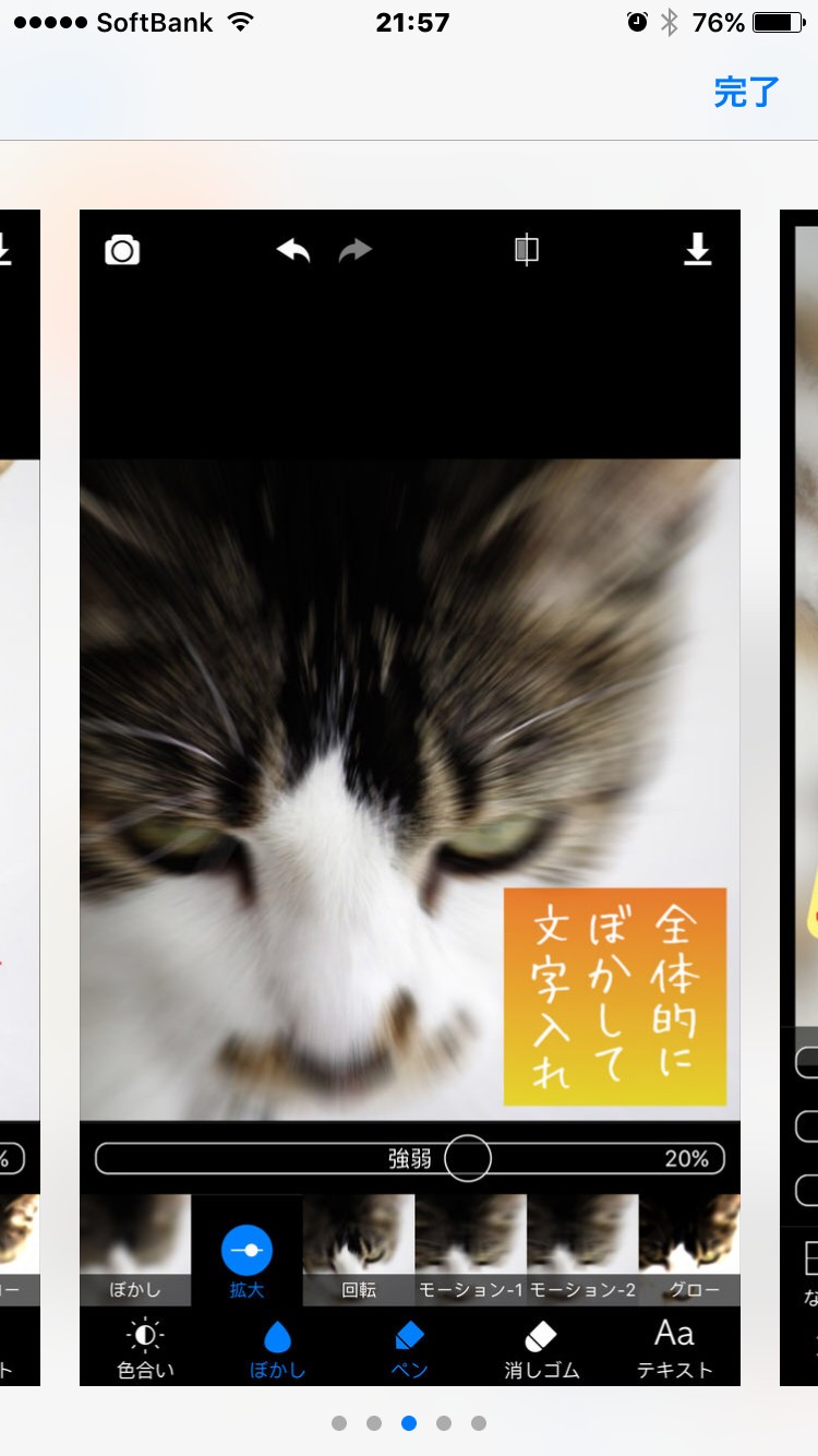 ぼかしたい場合は画面下の「ぼかす」のマークを押すだけです。あとはぼかしたい場所を指でなぞります。