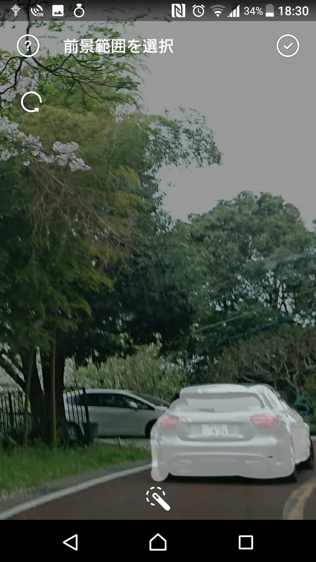 画面右の、音符の上にあるジグザグ状のアイコンをタップします。「前景範囲を選択」というメニューになります。これは、各種エフェクトの影響を受けないように、特定の箇所だけを保護する機能です。車の上で指をスライドさせて、前の車を白く塗り、完了したら元のメニューに戻ります。