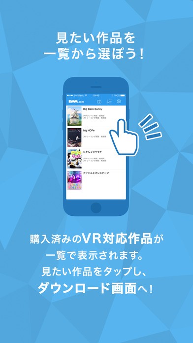 アプリを起動し、事前に購入しておいたDMM.com配布のVR対応動画を一覧から選択します。購入しているのに一覧に表示されない場合は、「購入済み」タブで画面上部を下にフリックすることで同期することができ、表示されるようになります。