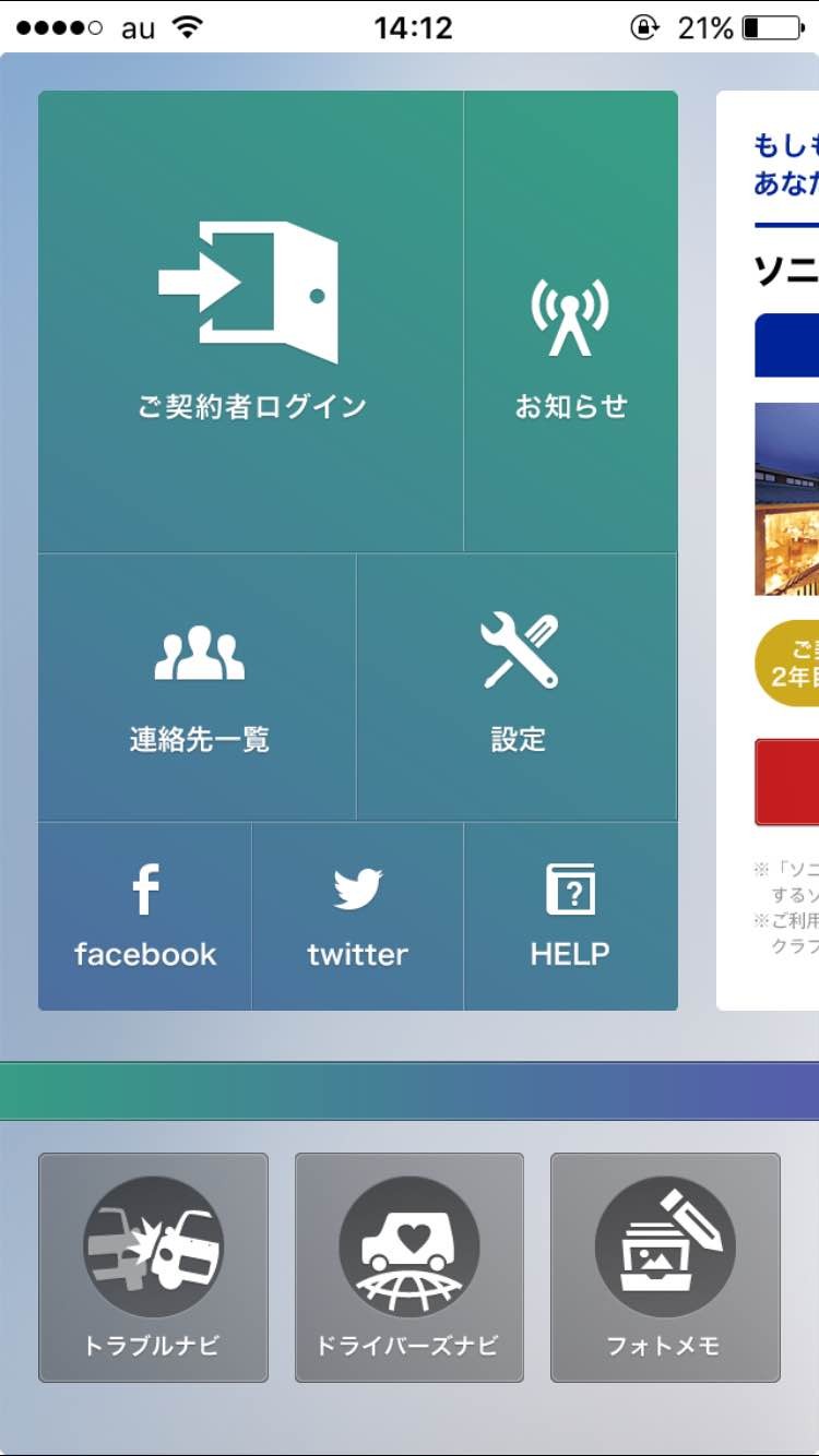 その他にアプリトップ画面下部には、「トラブルナビ」「ドライバーズナビ」とあり、ソニー損保が配信している公式アプリを