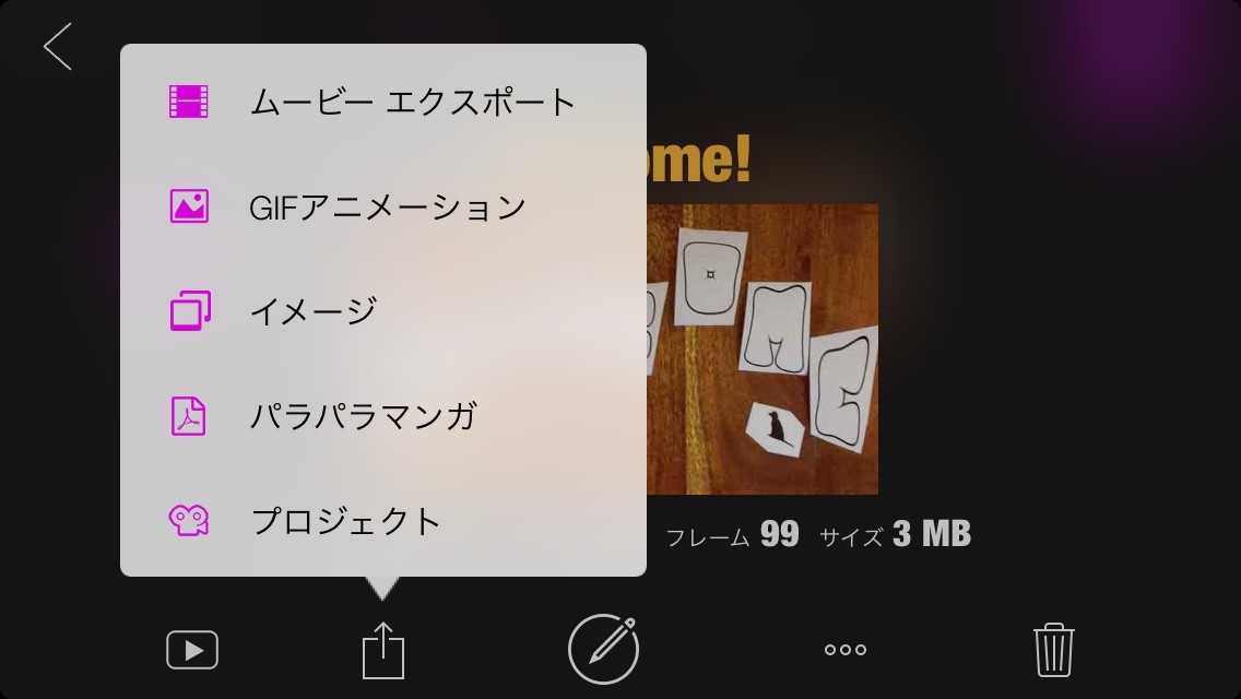 もちろんできます。YoutubeやFacebookを始め、LINEなど様々なアプリで共有することができます。ここまで簡単に作れると、ほんと単純すぎる構想でも共有したくなりますよね。あまりにも行程が複雑で時間がかかるとなると、たいそう大きなものを作らなければいけない、みたいな感じになってしまいますよね。また、ムービーとしてエクスポートして共有する他、GIFアニメーションとして保存したり、イメージとして保存したり、パラパラ漫画として保存したり、と「どういう形で作ったものを表すか」というのが本当に多様です。一つ残念だなと思ったところも言うと、ムービーとしてエクスポートする以外、アップロードにすごい時間がかかります。またスマホにGIFアニメーションの形でエクスポートとしてもそのようには保存されず、ある一コマの写真しか表示されませんでした。しかしPCに飛ばしてみたところ、みなさんもよく見るGIF画像として見ることが出来ました。なので私がストップモーション・アニメーションを作ったとして、それを共有したいと思ったらLINE等々で「ムービー」として共有しようと思いました。