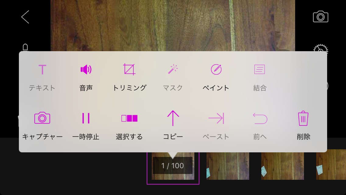 ただ写真としてコマ撮りするだけでは、前の項目でも指摘しましたが、カメラアプリやデジカメを使って撮れば済む話になってしまいます。しかし、このアプリはそれだけではもちろんなく、様々な機能・設定がついています。まずその「コマ撮り」をする時ですが、基本的に「撮影」と変わらないので、基本的なカメラの設定は出来ます。細かいことはよくわからないのですが、ISOとかWBとかです。また、「ストップモーション・アニメーション」を作るのに特化したアプリになっているので、そのためだけにやりやすい設定もできます。どういうことかと言うと、前の項目で「撮った写真が画面上に残り」と言いましたが、それも設定で変えられます。撮った画像を100%画面上に残したいと思えば残せますし、スマホを動かせば画面上に出ている被写体もそれ相応に動く(普通のカメラのアクティブ状態)で撮影することも可能です。また撮った画像自体の編集も簡単に出来ます。トリミングやペイント、テキストを入れたり、といったことです。なので、カメラを使って写真を撮影して、それをまた編集アプリで編集して…となるとすごいアプリや端末を超えた行程が多くて作るのもやっと、という感じですが、このアプリはこれだけでほぼ済んでしまうということです。