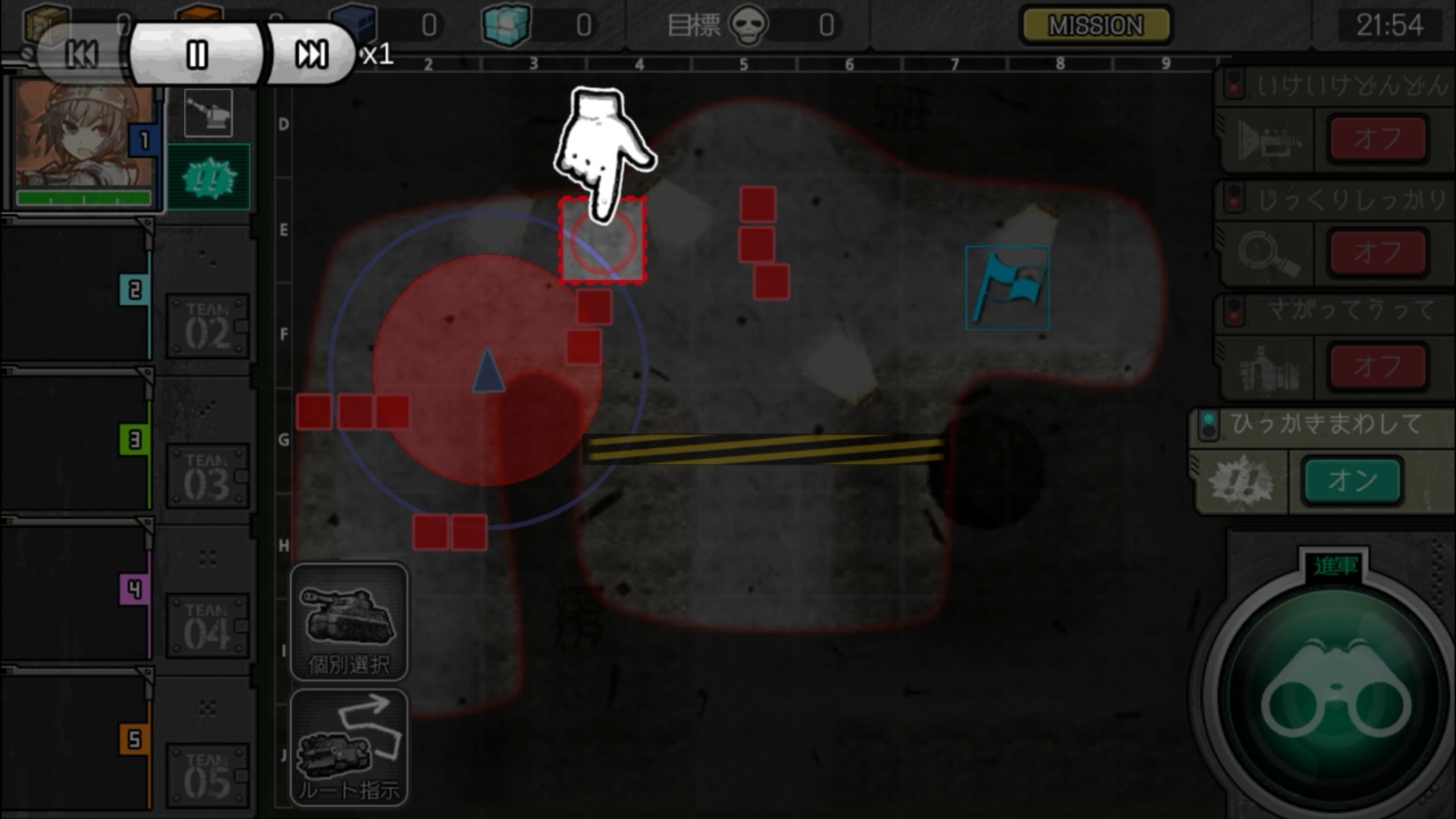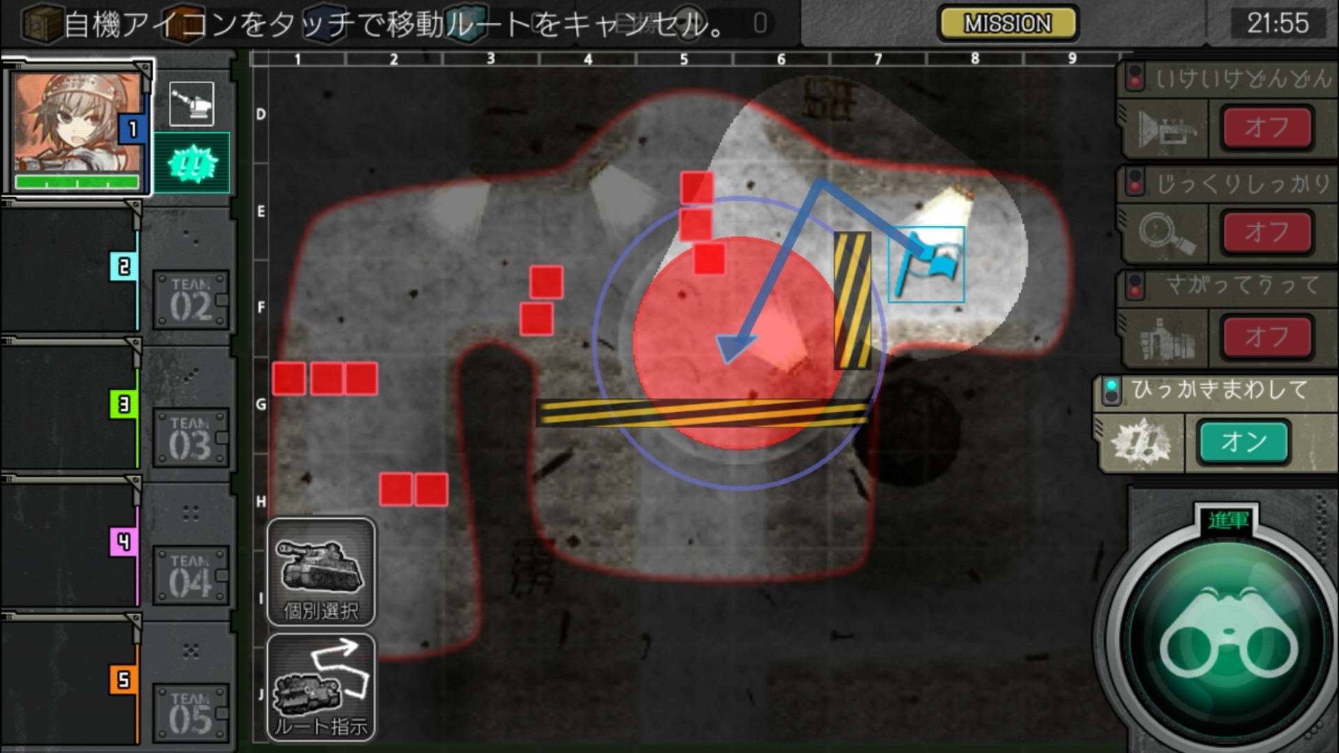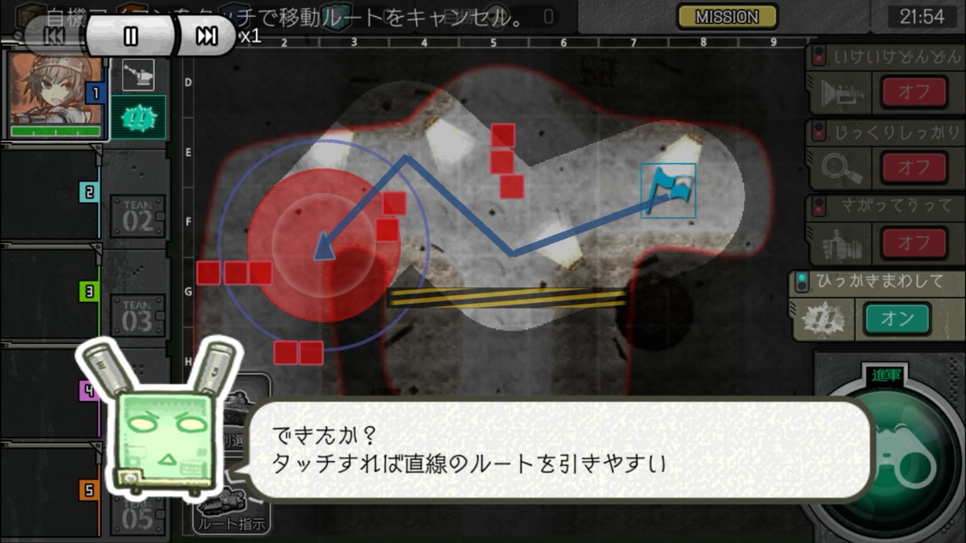 そんなときは、マップ画面に戻り、ハガネの進路を変更します。「▶」をタップするとなぞった線をキャンセル出来ますので、「▶」をタップして、障害物にハガネが当たらないように再度進路を引き直します。「▶」をタップすると何度でも引き直し可能なので、じっくり考えて進路を引くことも出来ますね!