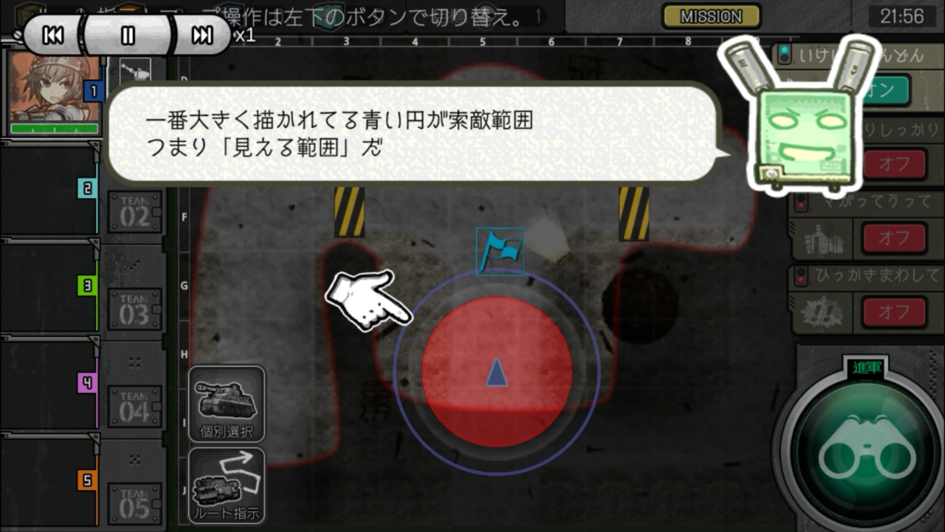 マップ画面の青い枠の範囲が捜索範囲「見えている範囲」です。まずはこの捜索範囲に敵のハガネを入れて、敵のハガネを見えるようにしないといけないのです!敵のハガネはマップ上に表示されませんから、探し出すのに苦労しそうです…!