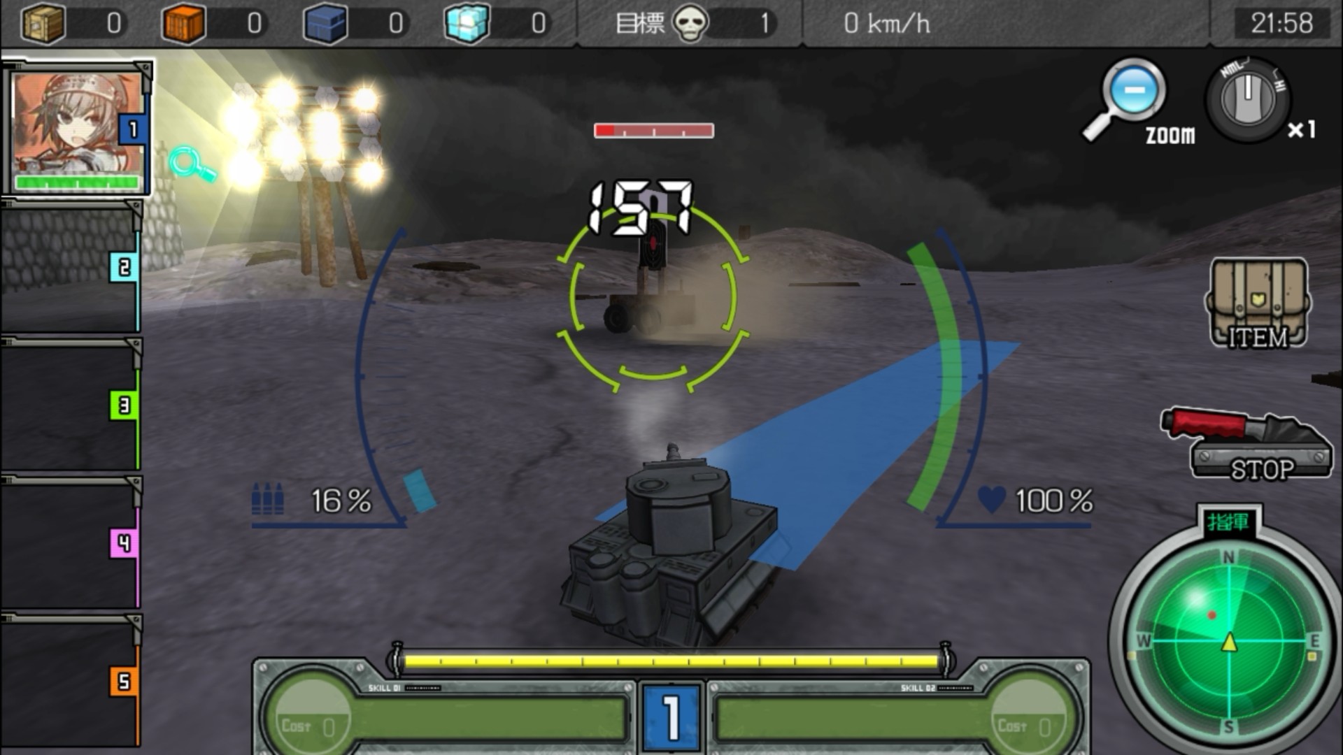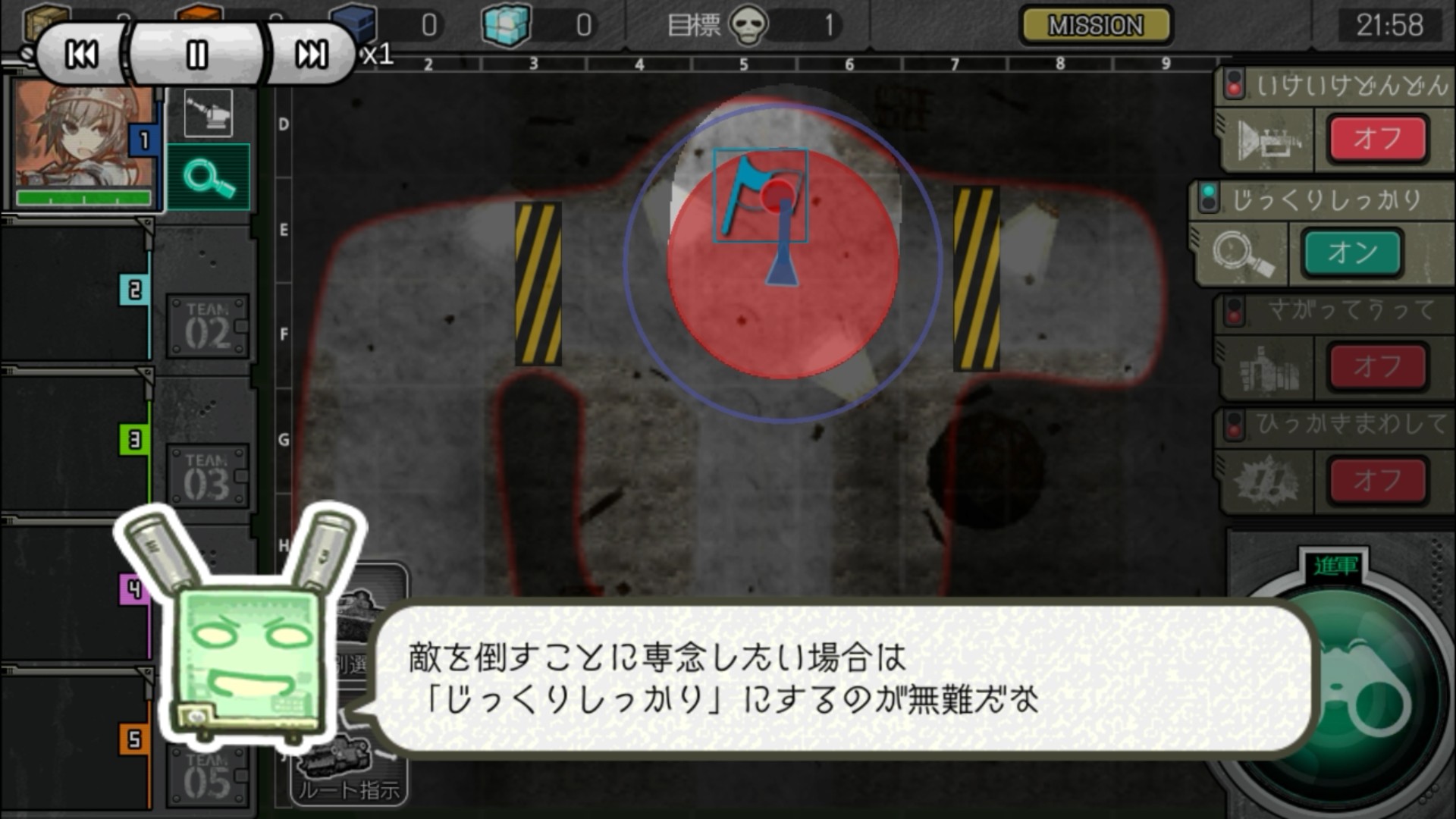 敵を見つけるとハガネは自動で攻撃をします。マップ画面の赤い枠の範囲が攻撃範囲、「攻撃できる範囲」です。なので、この赤い枠に入れないと敵のハガネを見つけても攻撃することが出来ません。また、ハガネの両側に表示されている「%」が「100%」のときに、ハガネは敵のハガネに攻撃をします。