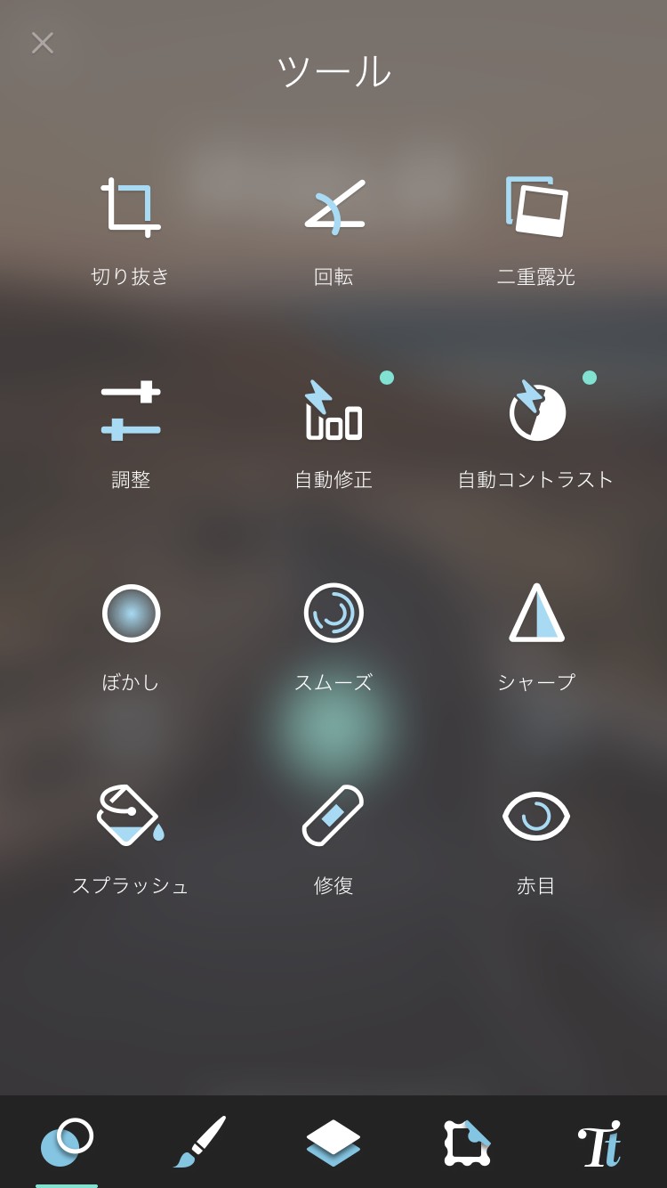 ぼかし、スムーズ、シャープ、スプラッシュ、補修、赤目のツールを選択することができ、