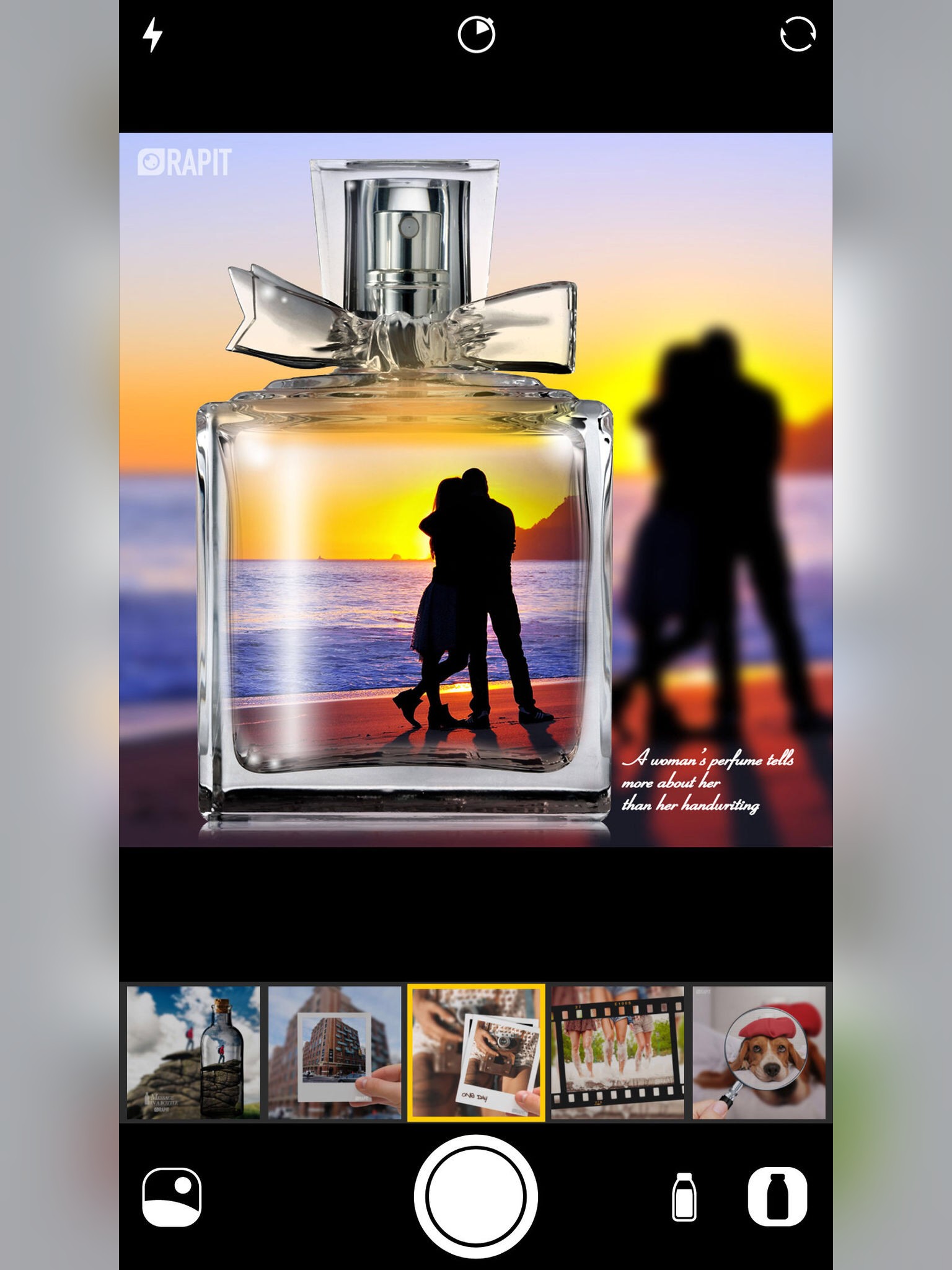写真を決めたら、フレームを決めます。このフレームが他のアプリではなかなかみかけないおしゃれなものでした。写真を香水の小瓶の中に埋め込んだようなフレームなのです。しかも、背景には同じ写真が使用されてまるで雑誌の表紙、広告ページのような印象を受けました。もちろん、香水の小瓶意外にも種類があります!