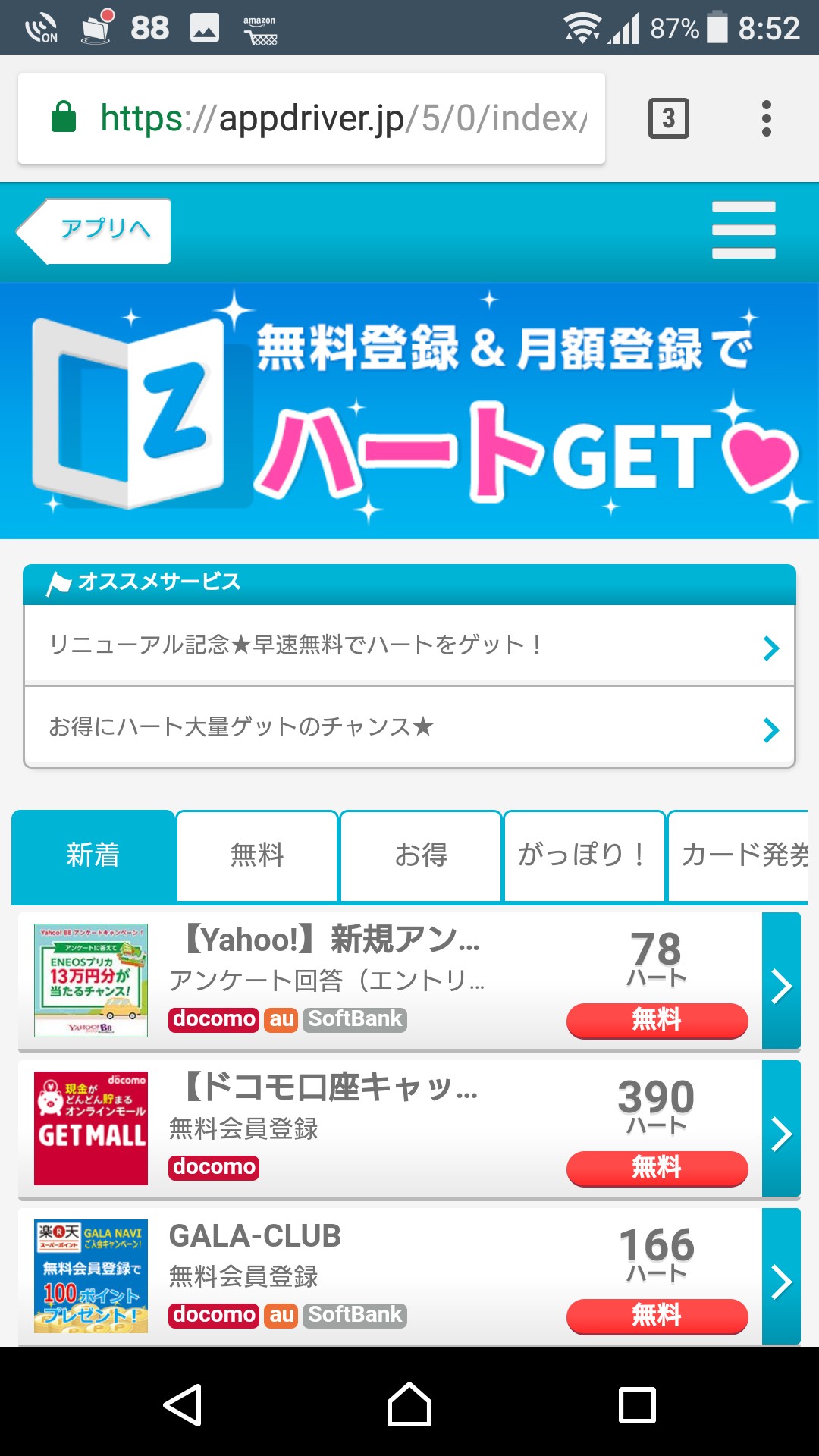 指定のアプリをダウンロードしたりサービスに登録したりすることで、ハートが一定数回復します。回復量は条件によって異なります。