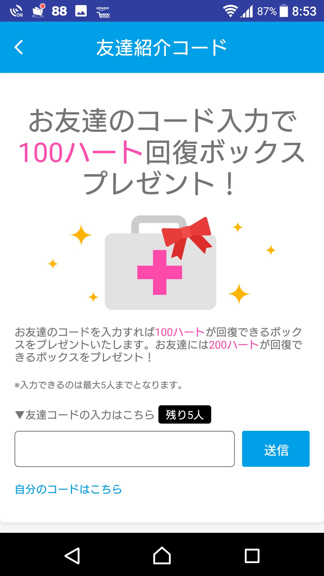 友達のコードを入力することで自分はハートを100個、友達は200個回復できます。