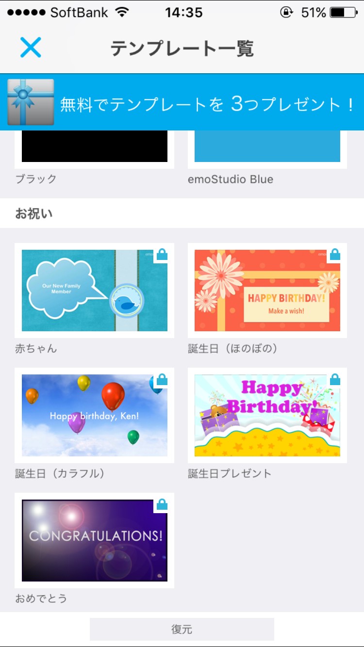 無料のものはシンプルなデザインとなっており、有料アドオンの中には祝い関連、家族関連などカテゴリごとにテンプレートが表示されています。