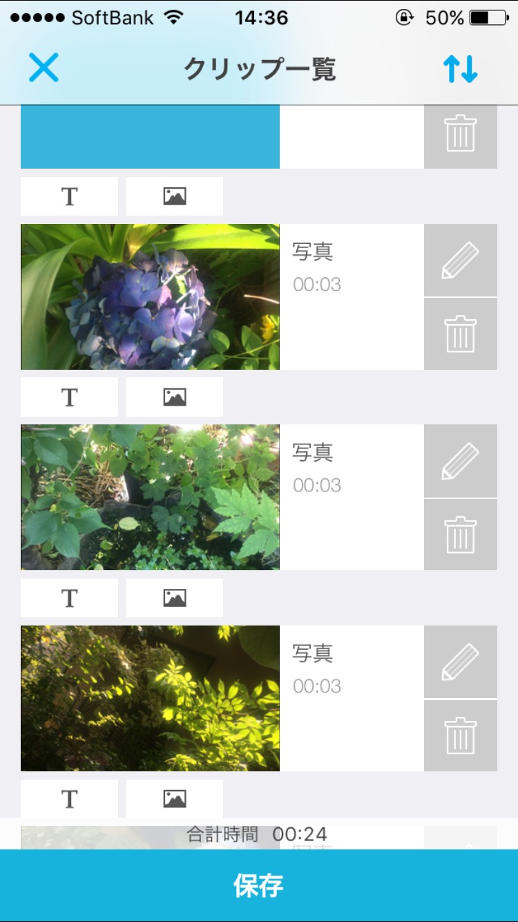 アプリを開くとトップページには今まで作成した動画一覧が表示されます。