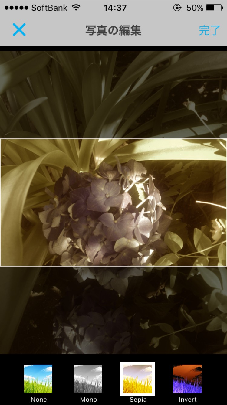 選択された写真または動画の素材に対してモノクロやセピアなどのフィルタをかけることも可能です。