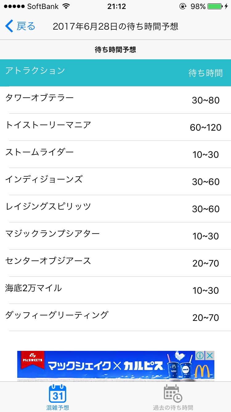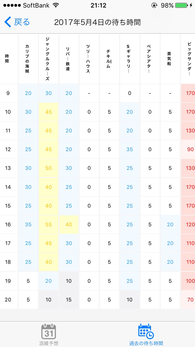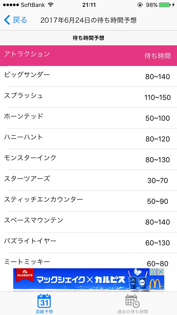 日付をタップすると、各アトラクションの待ち時間予想が表示されます。