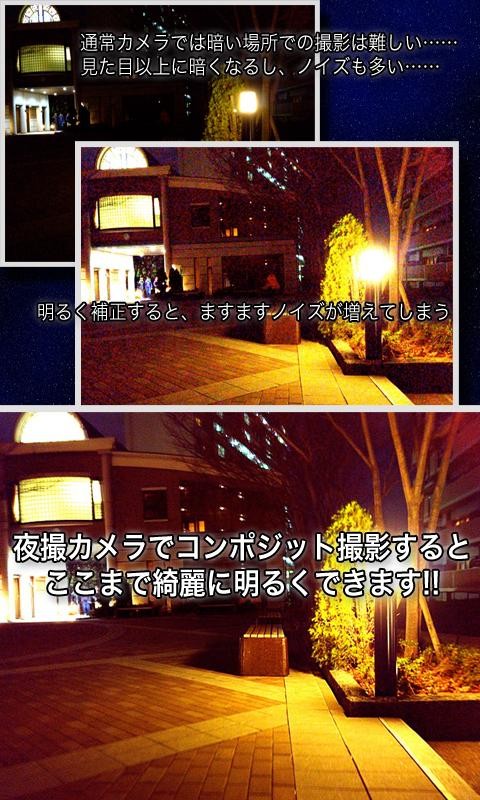 このアプリは暗闇での撮影に対応しており、夜景などを綺麗に撮るのに向いているカメラアプリになっています。光量の不足する夜景では、どうしても多くのノイズが発生しています。また、夕暮れなどでの撮影では、十分明るいと思っていても、意外なほどノイズがのっているものなのです。長時間露光すればノイズは消えますが、三脚で固定しておかないと、ブレてまともに撮影することができません。そういった環境での撮影に向いているカメラアプリになります。