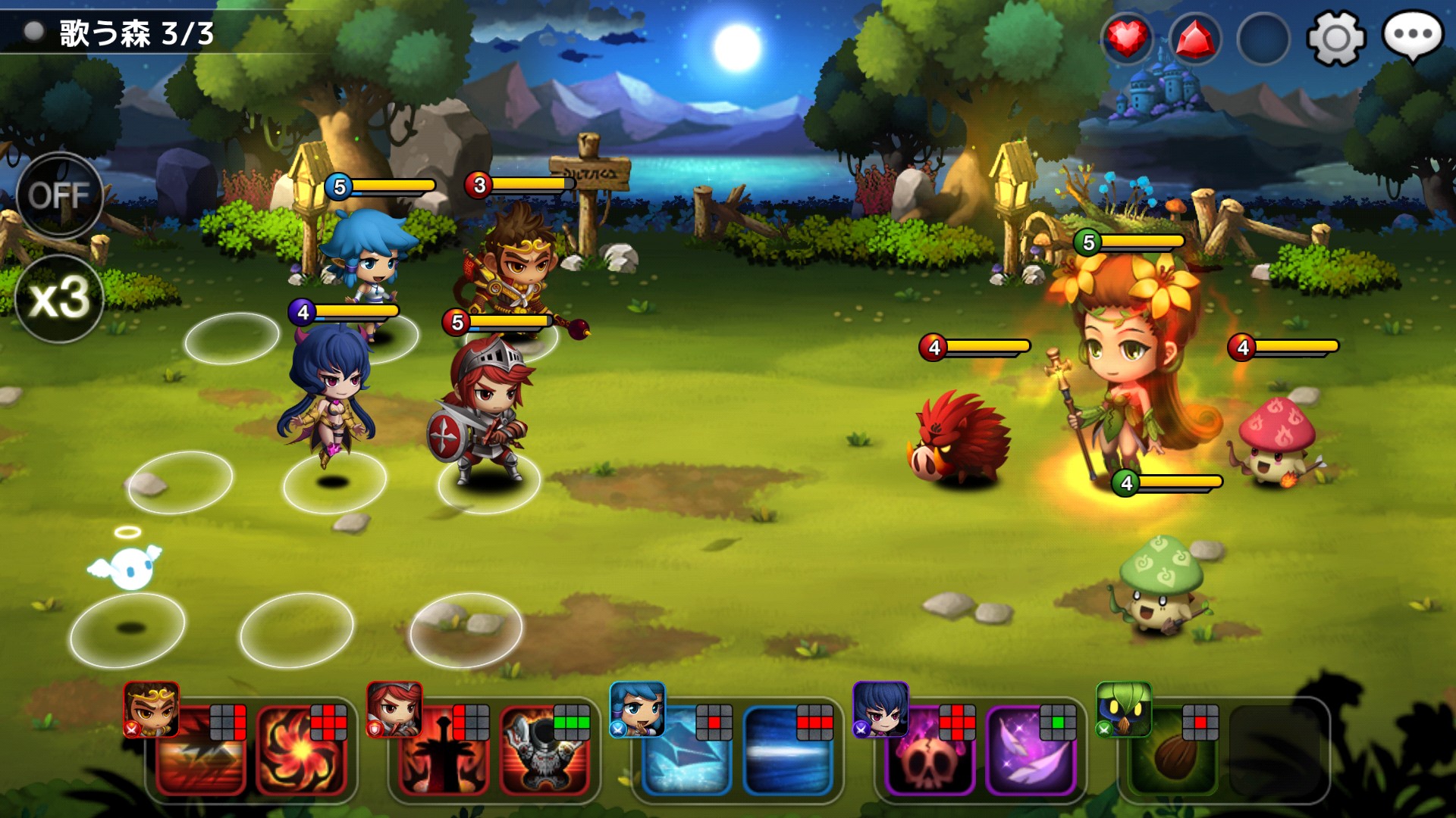 異なるスキルを保持するヒーローたちは、敵のマスに対しても固定の攻撃スキルを持っているため、前衛後衛だけではなく、スキルの攻撃範囲を考えた編成をしていく必要があります。