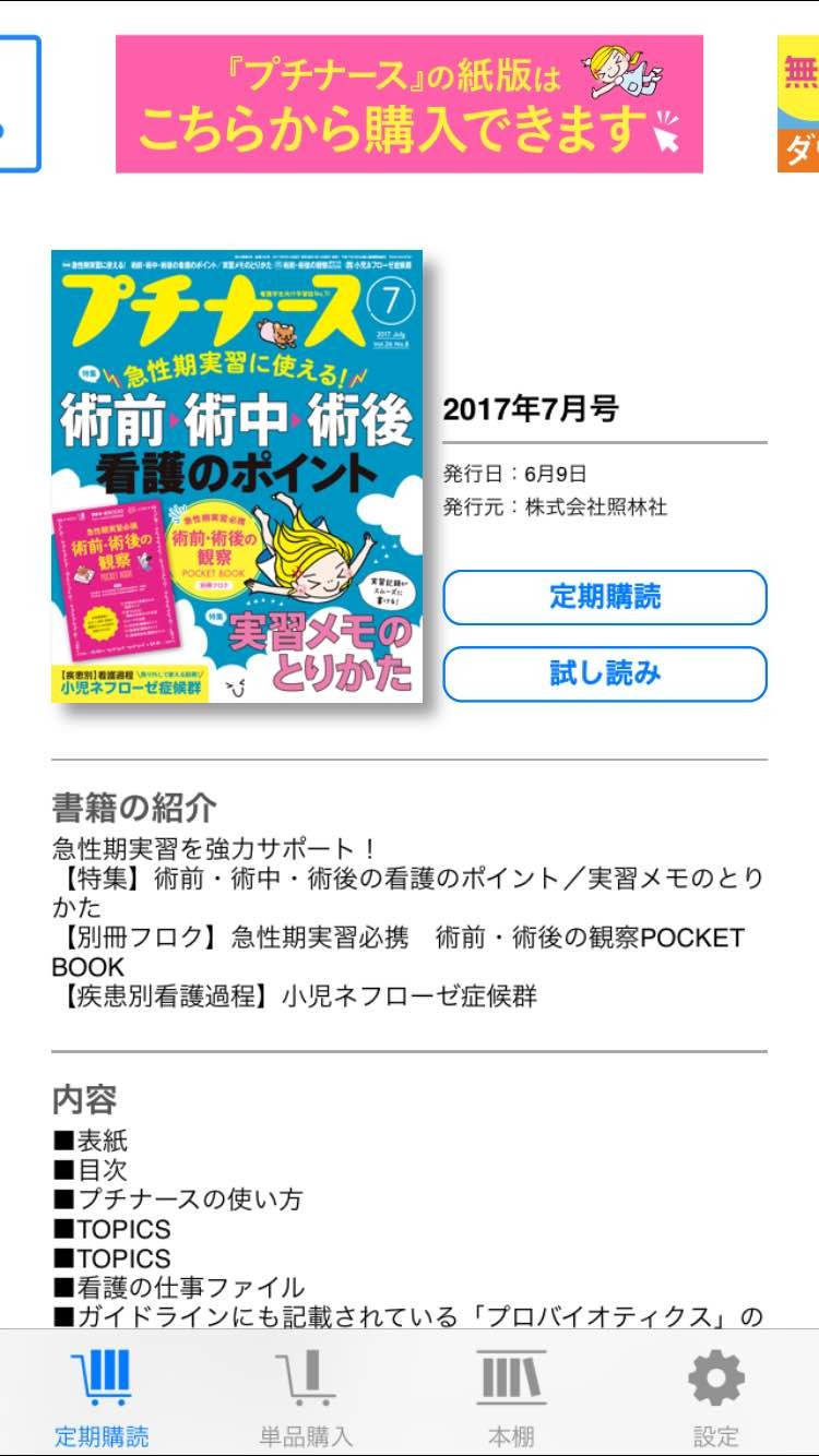 本アプリでは、電子書籍版の「プチナース」を定期購読することが可能です。