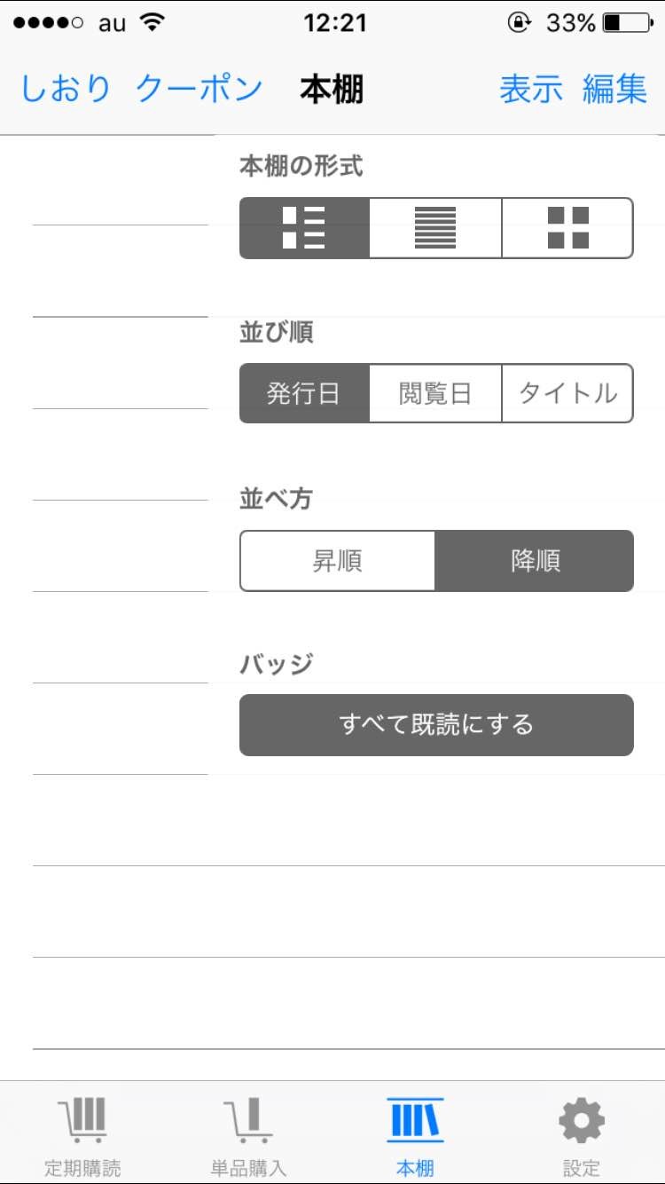 さらに、画面右上の「表示」からは「本棚の形式」「並び順」「並べ方」「バッジ」と機能があります。