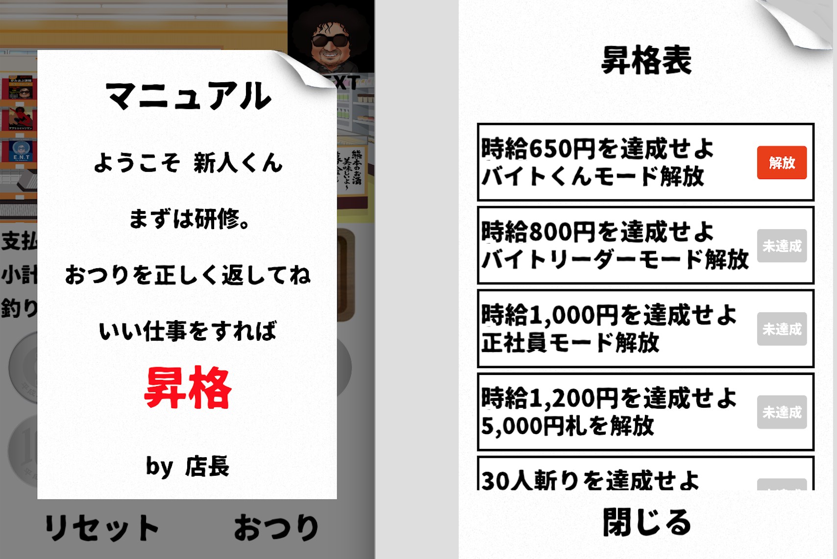 メニューの中に「昇格表」があり、時給650円を達成すると「バイトくんモード」が解放され、連続斬りを達成すると新たなお客さんが解放されて行きます。